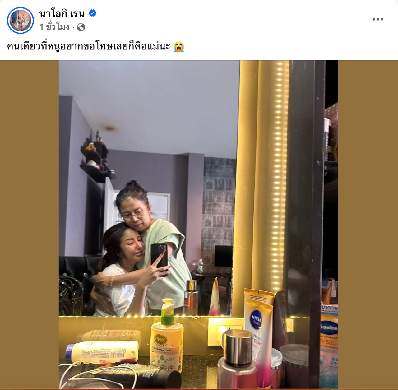 - นัสโพสต์ต่อรัวๆ ด้วยรูปกอดแม่ พร้อมเขียนข้อความว่า "คนเดียวที่หนูอยากขอโทษเลยก็คือแม่นะ"