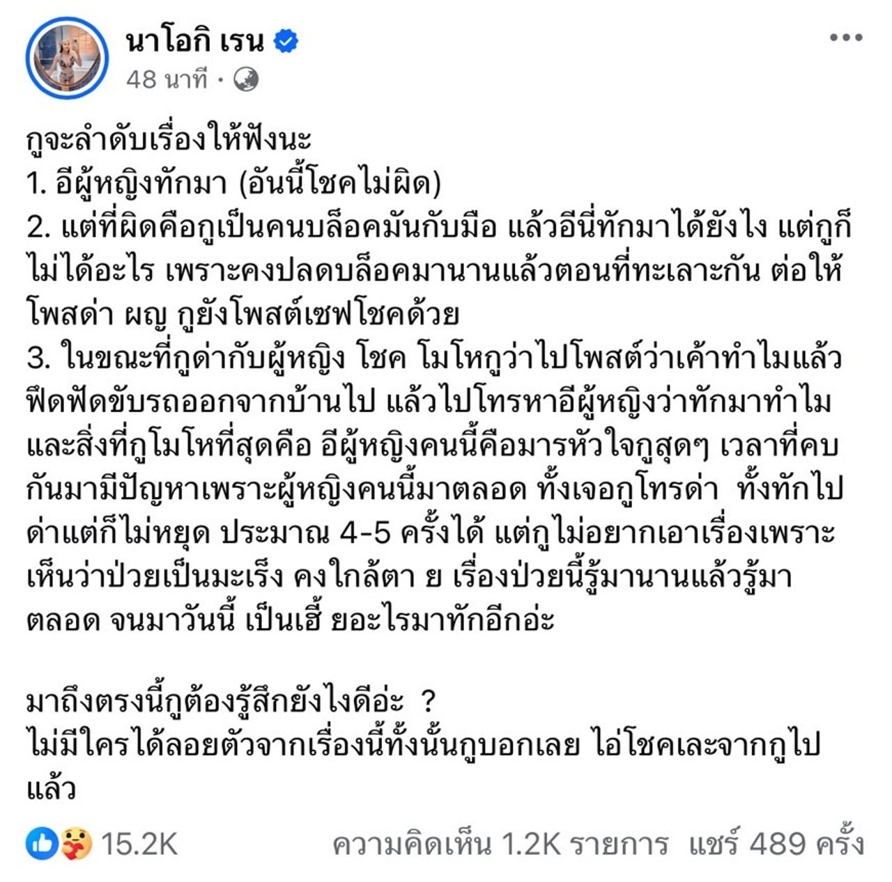 ล่าสุด นัส จุฑารัตน์ ได้โพสต์ข้อความไล่เรียงดราม่าดังกล่าวผ่านทางเฟซบุ๊กส่วนตัว นาโอกิ เรน โดยมีเนื้อหาดังนี้