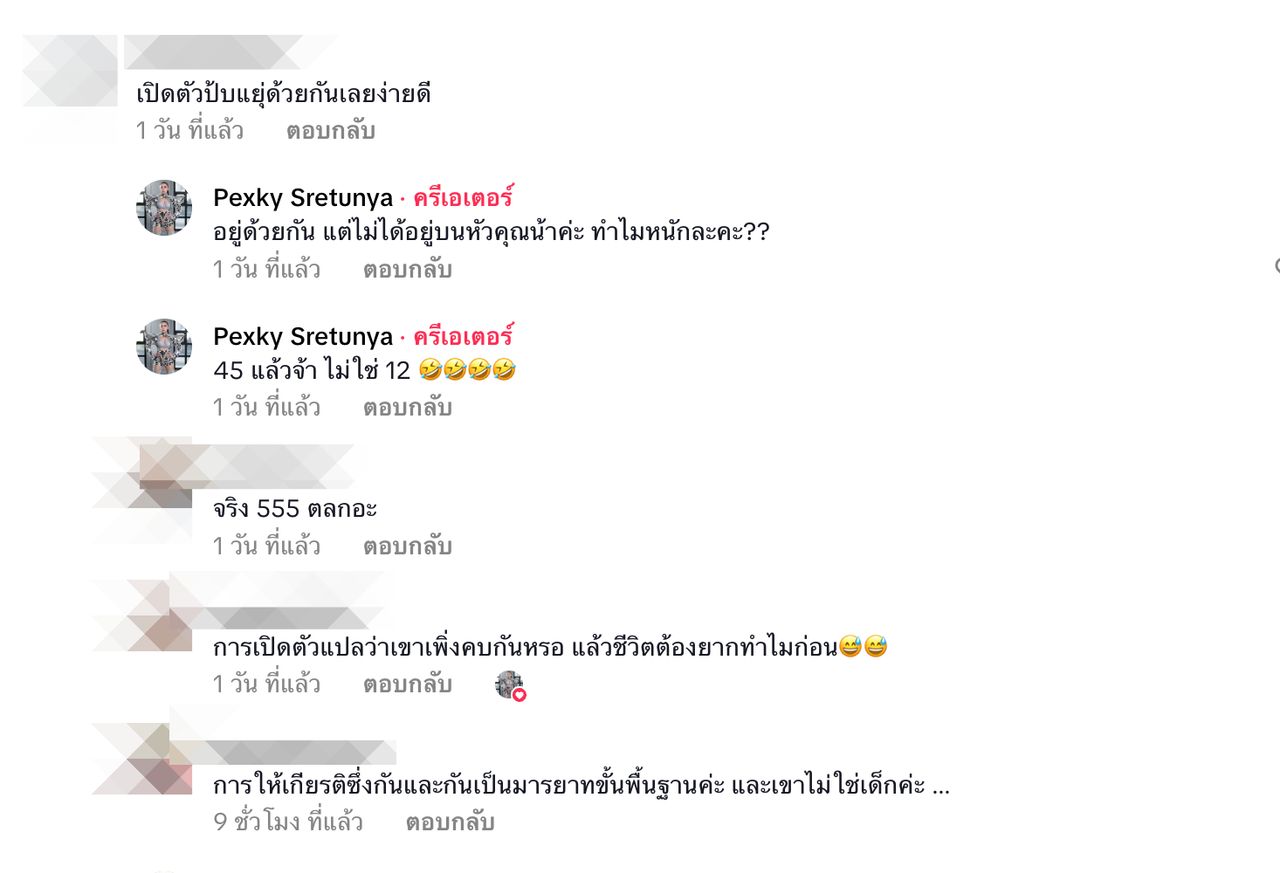 และหลังจากที่ชาวเน็ตได้เห็นคลิปดังกล่าว ก็เข้ามาคอมเมนต์แซวในความเป็นมือใหม่หัดทำคอนเทนต์ของทั้งคู่ แต่งานนี้ก็มีชาวเน็ตรายหนึ่งเข้ามาคอมเมนต์แซะเป็กกี้ว่า "เปิดตัวปุ๊บอยู่ด้วยกันเลยง่ายดี" งานนี้เป็กกี้เลยตอบกลับจัดให้แบบเจ็บๆ ว่า "อยู่ด้วยกัน แต่ไม่ได้อยู่บนหัวคุณน้าค่ะ ทำไมหนักละคะ??" และ "45 แล้วจ้า ไม่ใช่ 12"