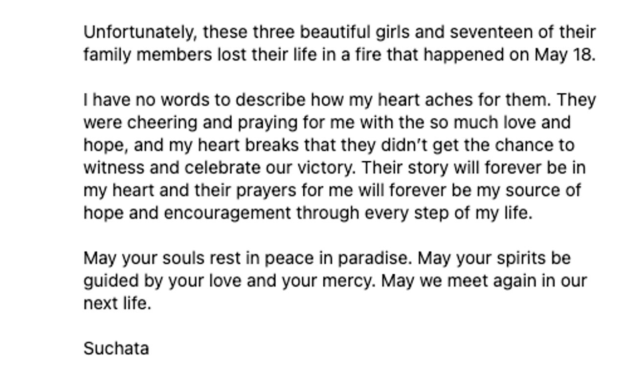 ทำเอา โอปอล สุชาตา Miss World 2025 โพสต์ข้อความสุดเศร้าหลัง FC ตัวน้อยที่คอยเชียร์โอปอลได้เสียชีวิตจากเหตุการณ์ไฟไหม้ โดยโอปอลได้โพสต์ข้อความอาลัยถึงเด็กๆ ที่น่ารักทั้ง 3 คนว่า