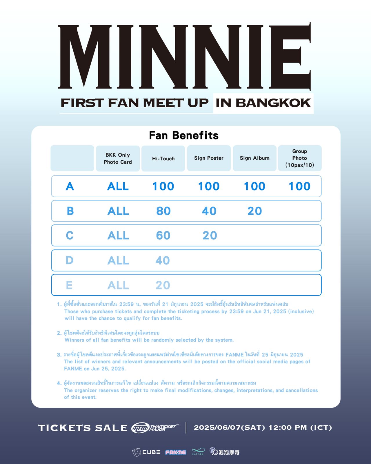 MINNIE ถือเป็นหนึ่งในแทกุกไลน์ ที่สร้างชื่อในวงการ K-POP ได้อย่างสวยงาม ด้วยเสียงร้องละมุน ความสามารถด้านการแต่งเพลง และคาแร็กเตอร์สดใสที่ใครก็หลงรัก จนสามารถครองใจแฟนคลับทั่วโลก วันนี้ถึงเวลาแล้วที่แฟนคลับชาวไทยจะได้สัมผัสโมเมนต์สุดพิเศษที่จะอัปเลเวลความใกล้ชิดกว่าที่เคย พร้อมโชว์สุดเอ็กซ์คลูซีฟที่เตรียมมาเพื่องานนี้โดยเฉพาะ รวมไปถึงร่วมลุ้นเบเนฟิตสุดฟิน
