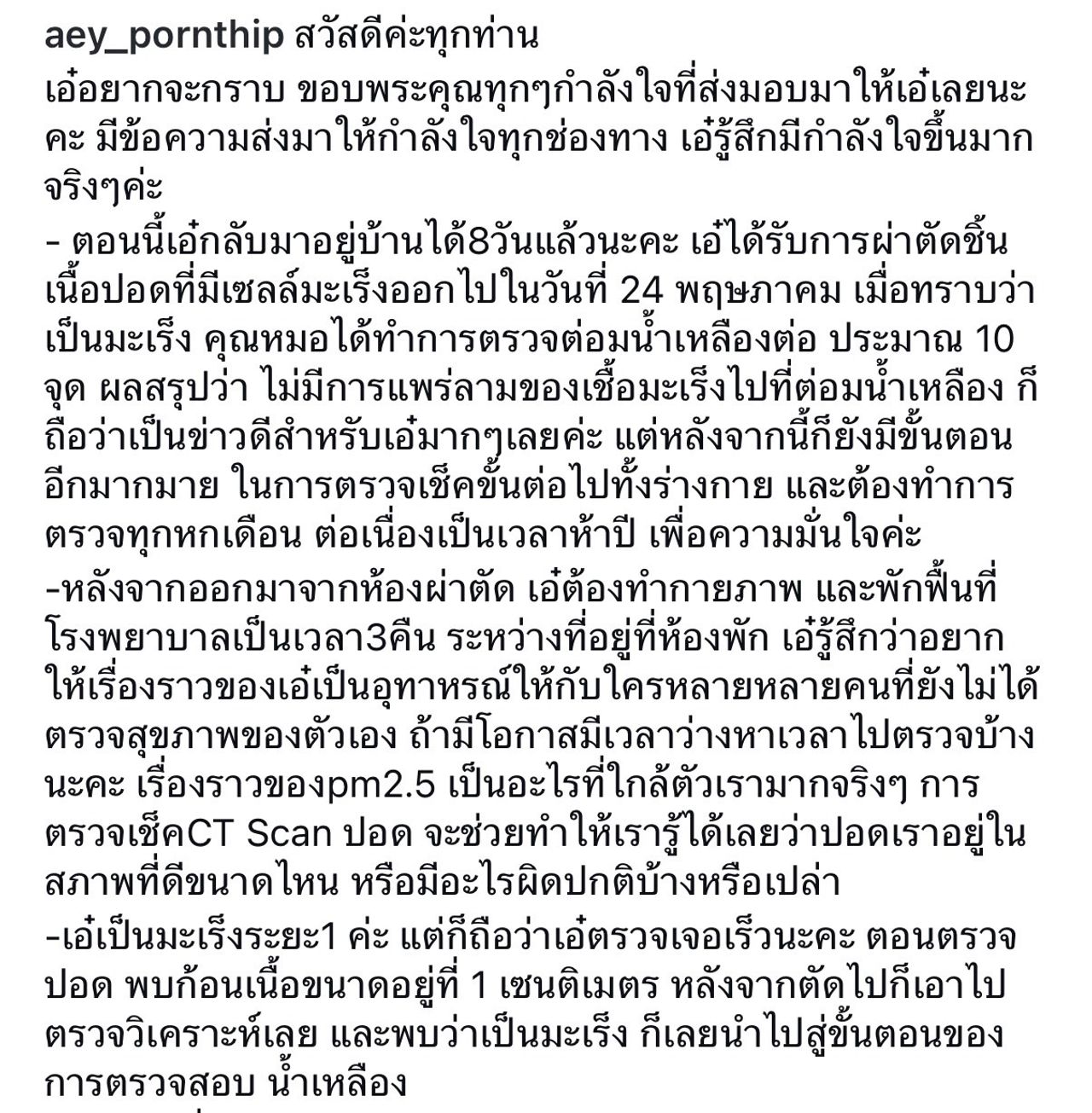 -หลังจากออกมาจากห้องผ่าตัด เอ๋ต้องทำกายภาพและพักฟื้นที่โรงพยาบาลเป็นเวลา 3 คืน ระหว่างที่อยู่ที่ห้องพัก เอ๋รู้สึกว่าอยากให้เรื่องราวของเอ๋เป็นอุทาหรณ์ให้กับใครหลาย ๆ คนที่ยังไม่ได้ตรวจสุขภาพของตัวเอง ถ้ามีโอกาสมีเวลาว่างหาเวลาไปตรวจ เรื่องราวของ PM2.5 เป็นอะไรที่ใกล้ตัวเรามากจริง ๆ การตรวจเช็ก CT Scan ปอดจะช่วยทำให้เรารู้ได้เลยว่าปอดเราอยู่ในสภาพที่ดีขนาดไหน หรือมีอะไรผิดปกติบ้างหรือเปล่า