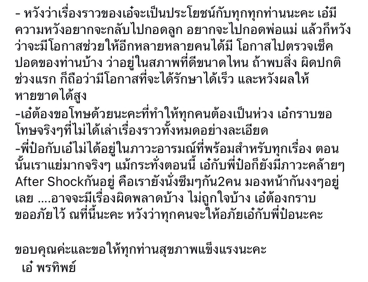 - เอ๋ต้องขอโทษที่ทำให้ทุกคนต้องเป็นห่วง เอ๋กราบขอโทษจริง ๆ ที่ไม่ได้เล่าเรื่องราวทั้งหมดอย่างละเอียด