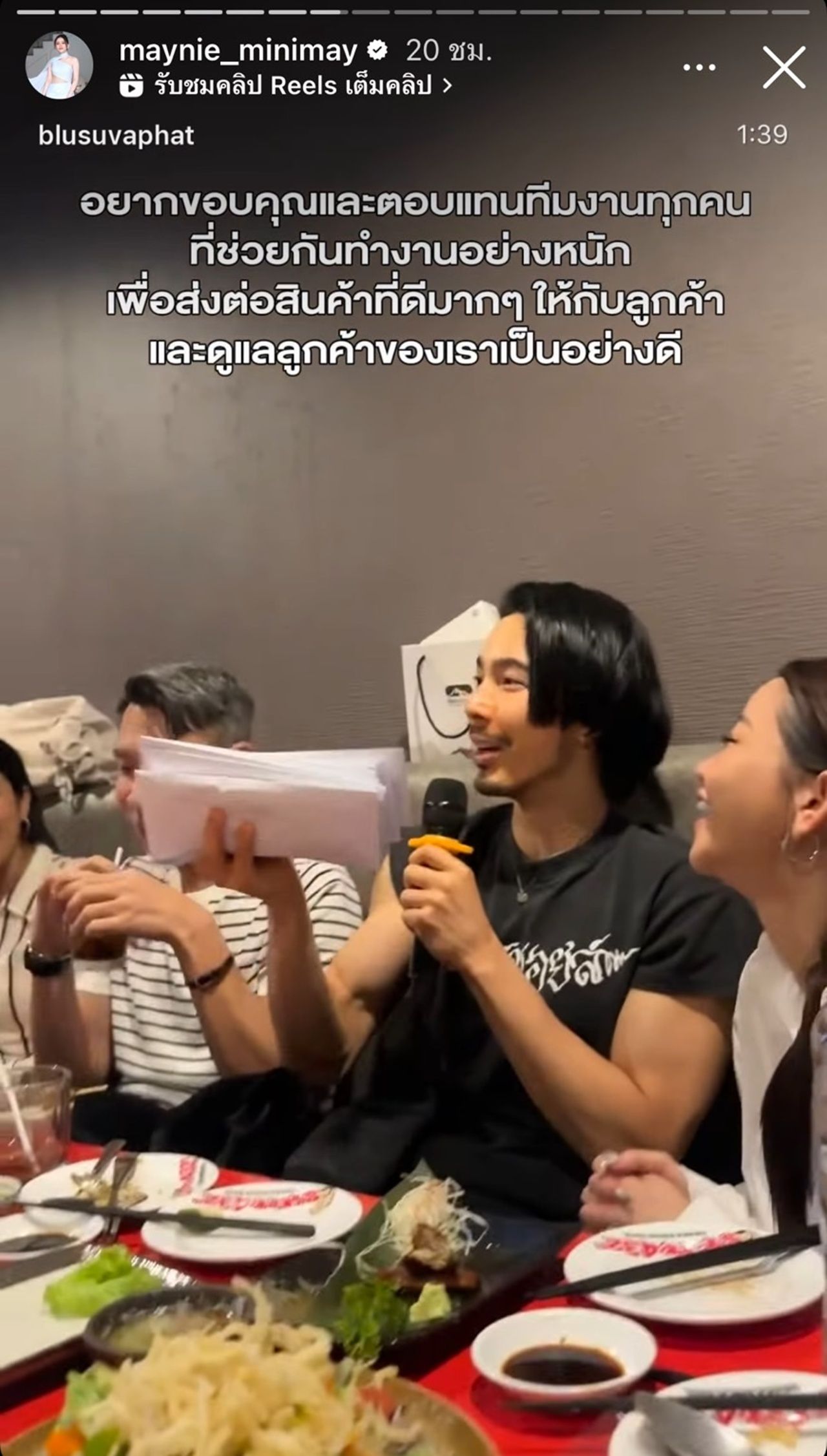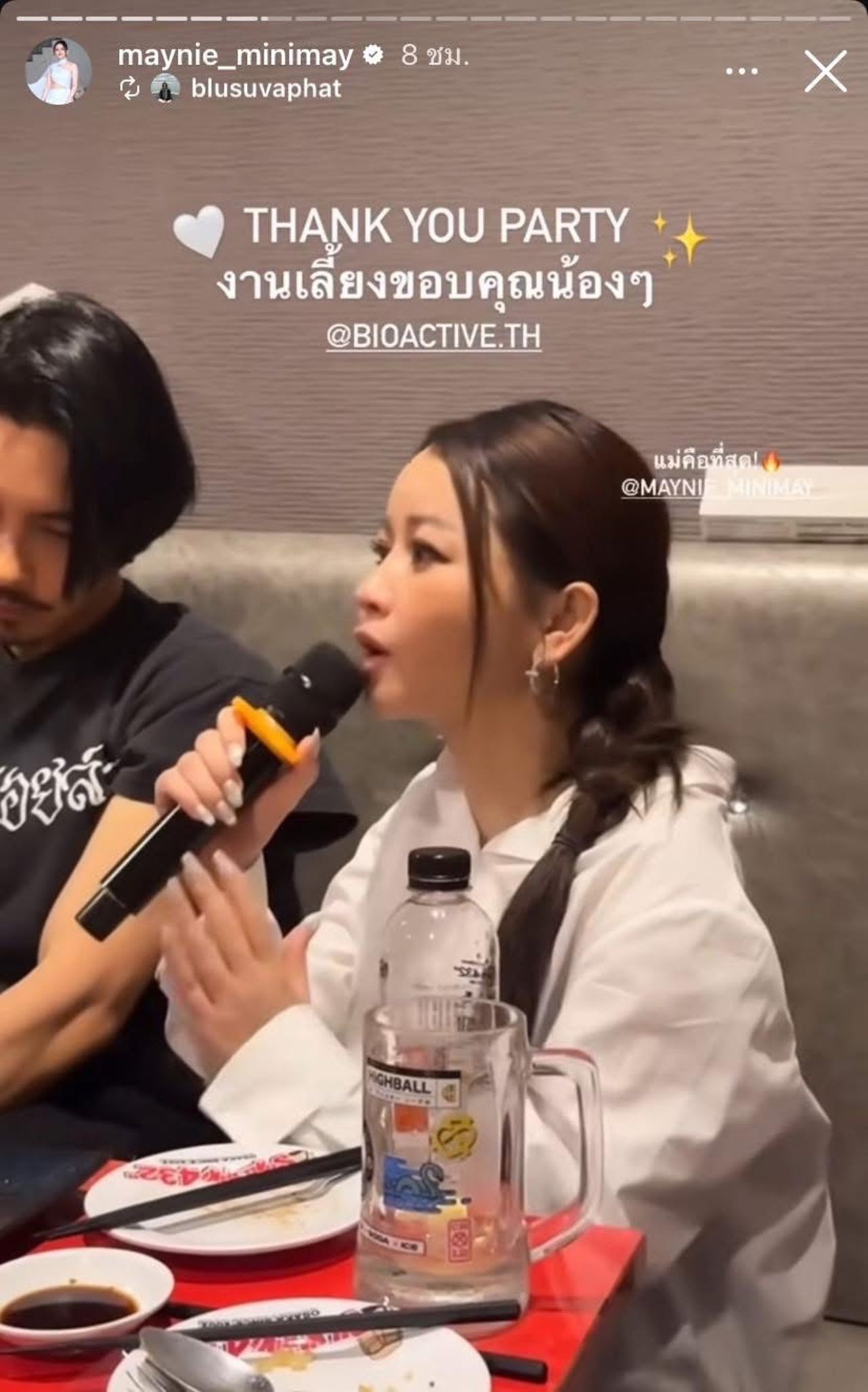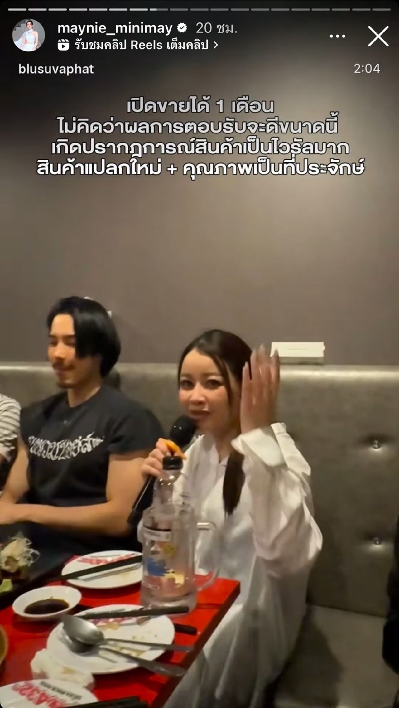 นอกจากนี้ เมย์ยังได้รีโพสต์สตอรี่ในอินสตาแกรม ซึ่งเป็นโมเมนต์ที่เมย์และจี๋กำลังประกาศข่าวดีเกี่ยวกับยอดขายของบริษัทให้ทีมงานฟัง แถมยังแจกซองเงินหนาเพื่อเป็นกำลังใจให้กับทีมงานด้วย