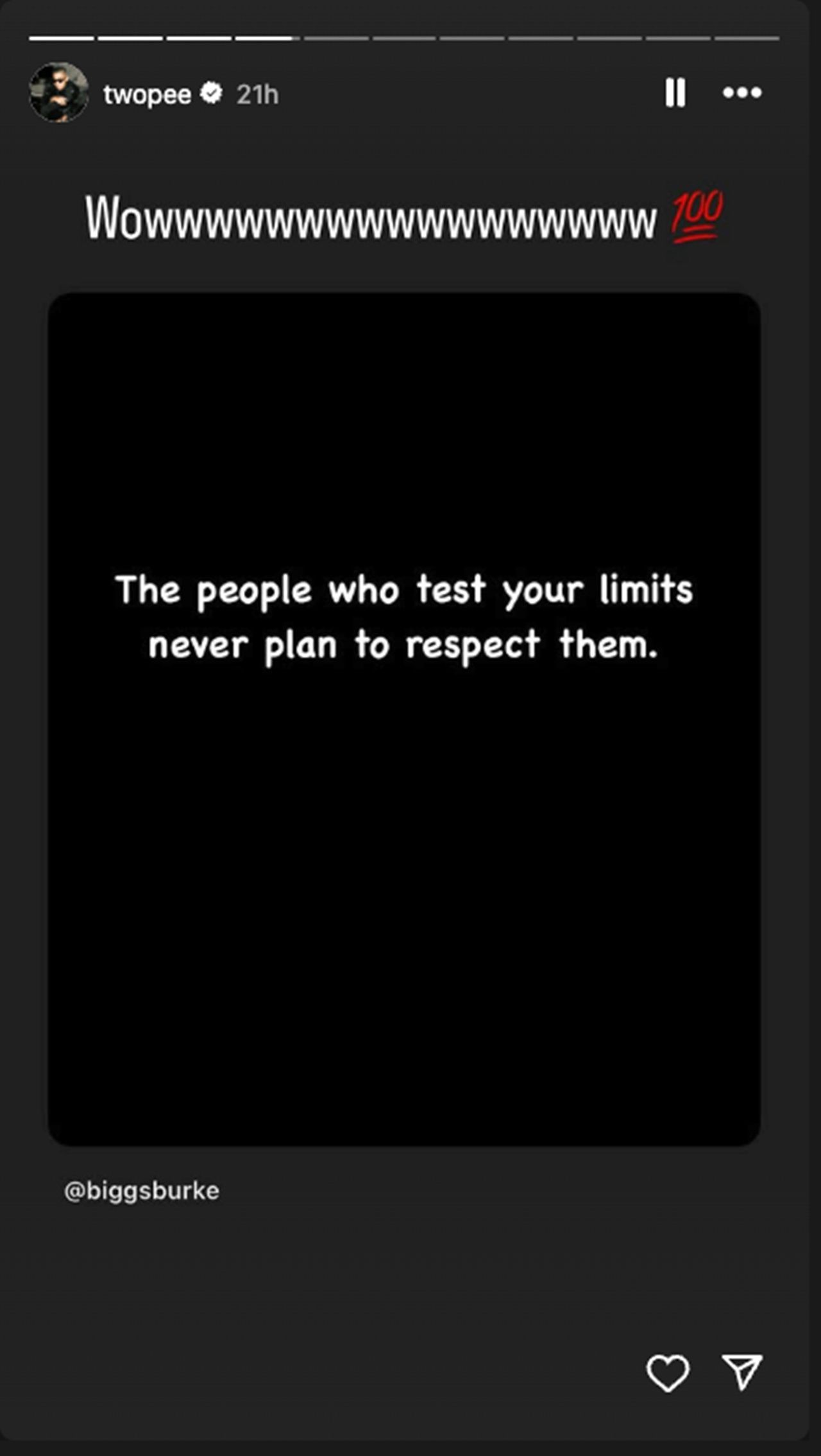 ด้าน โต้ง ก็ได้โพสต์ข้อความผ่านไอจีสตอรี่เช่นกัน เขียนว่า "The people who test your limits never plan to respect them" (คนที่ชอบทดลองและล้ำเส้นเรา ไม่ได้ตั้งใจจะเคารพเราตั้งแต่แรก)