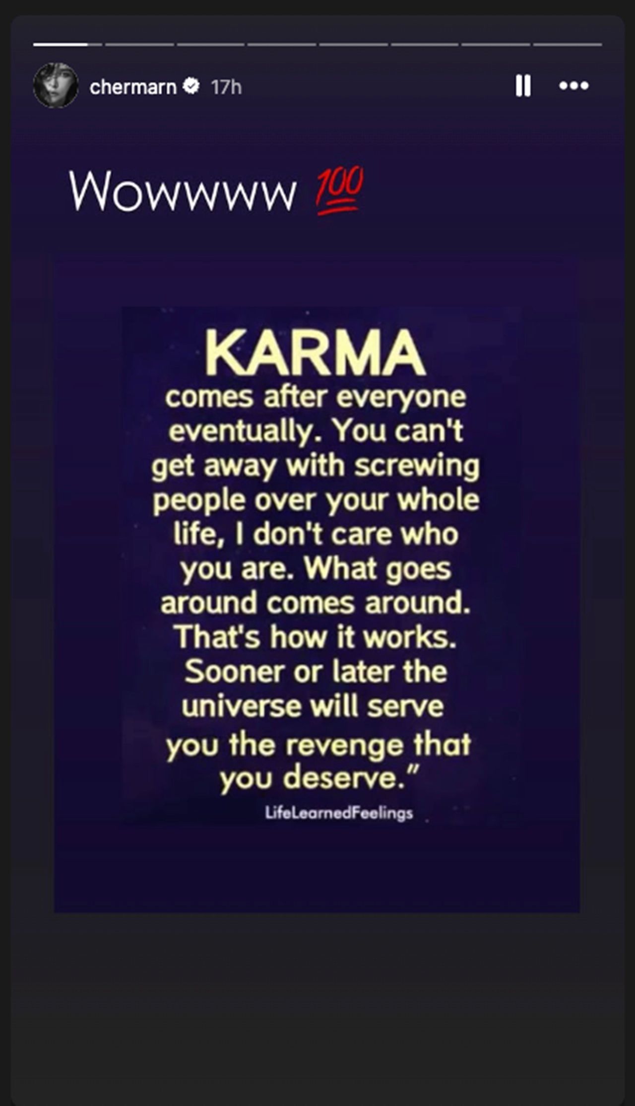 และล่าสุด พลอย ได้ลงข้อความผ่านทางไอจีสตอรี่ที่เขียนถึงเรื่องเวรกรรมที่ตามสนองว่า "KARMA comes after everyone eventually... the universe will serve you the revenge that you deserve" (กรรมตามสนองทุกคนในที่สุด... จักรวาลจะจัดให้ตามที่คุณได้ทำไว้)