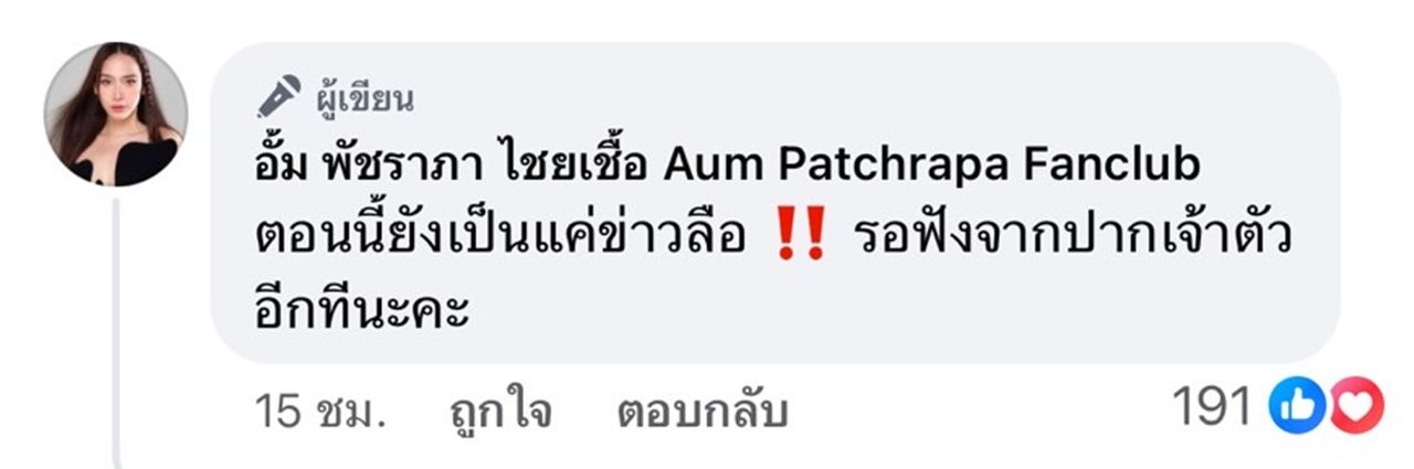 ขณะที่แฟนเพจ อั้ม พัชราภา ไชยเชื้อ Aum Patchrapa Fanclub ก็ได้โพสต์เกี่ยวกับข่าวดังกล่าว และเขียนว่า "ตอนนี้ยังเป็นแค่ข่าวลือ รอฟังจากปากเจ้าตัวอีกทีนะคะ"