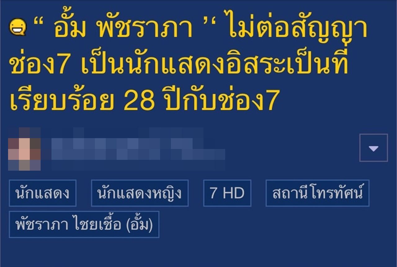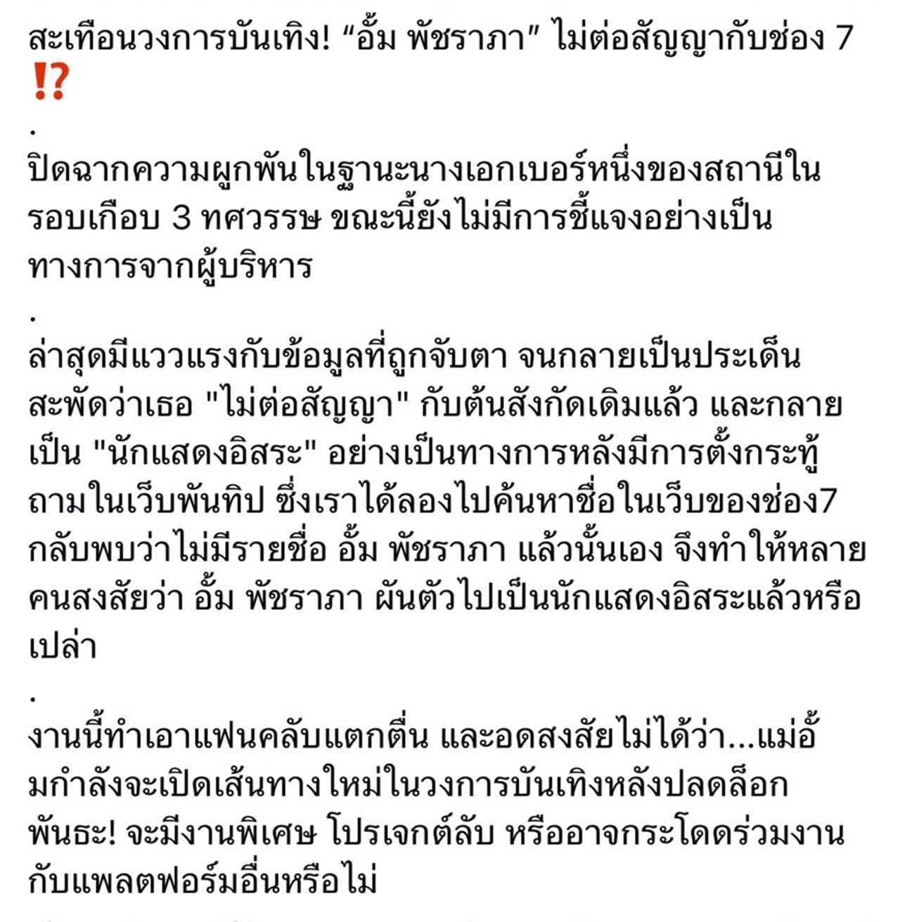 เนื้อหาในกระทู้นั้นได้เขียนว่า "ไม่ต่อสัญญาแล้วนะ ในเว็บไซต์รายชื่อข้อมูล ช่อง 7 ไม่มี อั้ม พัชราภา แล้วนะ ไม่ได้ต่อแล้วเป็นดาราอิสระ ตั้งแต่ตอนนี้ ชื่อในเว็บที่หลุดสัญญา จะมี อั้ม ฐิสา มุกดา เข้ม เวียร์ นาว สกาย จินณ์ ดีใจด้วยค่ะ อยากให้อิสระนานแล้ว ขอบคุณแทนคุณอั้ม ที่ช่องดูแลมาตลอดจะ 30 ปี"