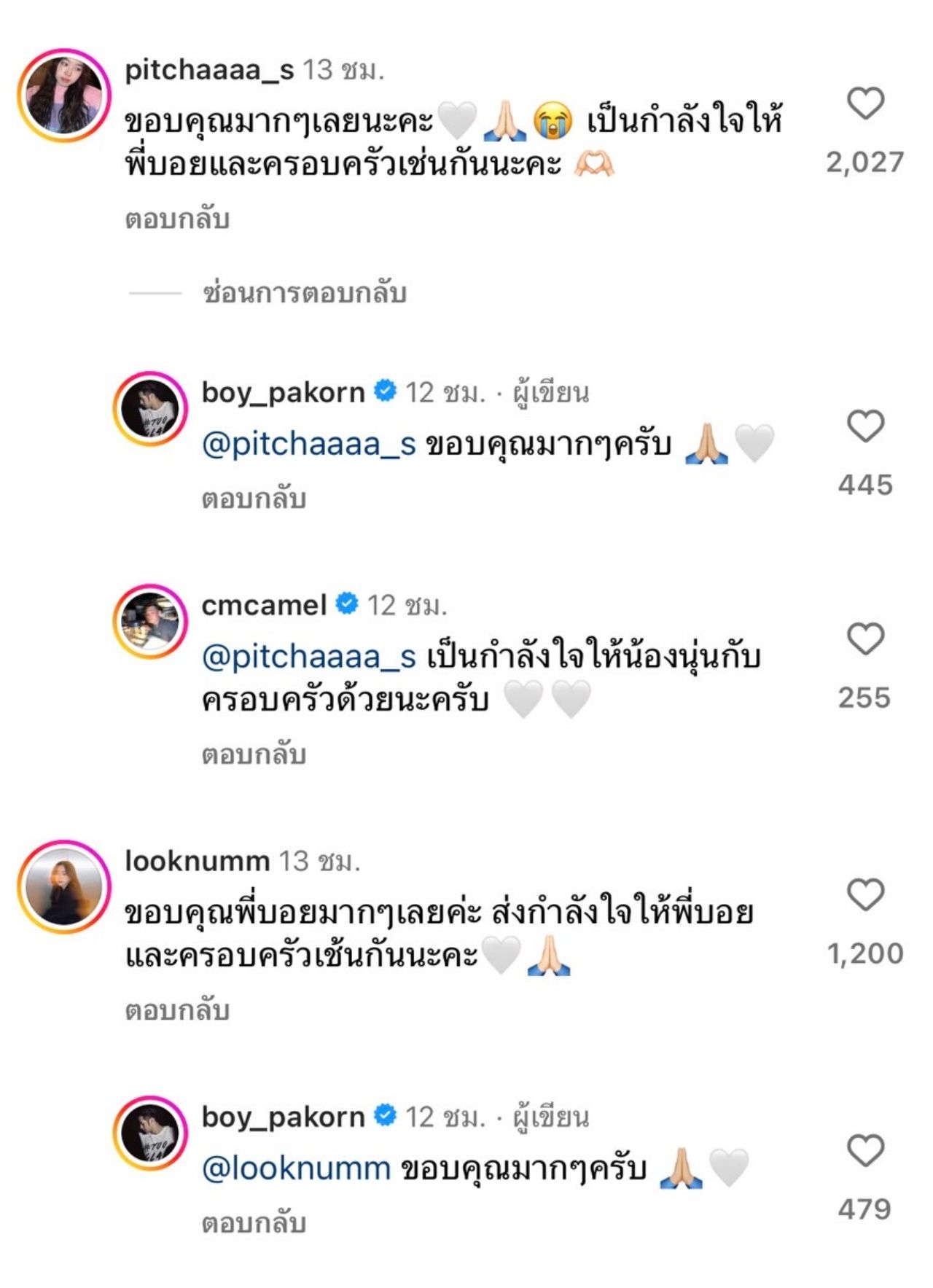ด้าน แอฟ ทักษอร ก็ได้เข้ามาคอมเมนต์ขอบคุณ พร้อมกับให้กำลังใจ บอย ปกรณ์ ด้วยเช่นกัน บอกว่า "ขอบคุณมากอีกครั้งนะคะ เป็นกำลังใจให้บอยและครอบครัวเช่นกันค่ะ" และ นนกุล ก็ได้เข้ามาคอมเมนต์ขอบคุณบอย ปกรณ์ ว่า "ขอบคุณมากครับพี่บอย ดีใจมากๆที่ได้มีโอกาสคุยกับพี่บอยนะครับ"