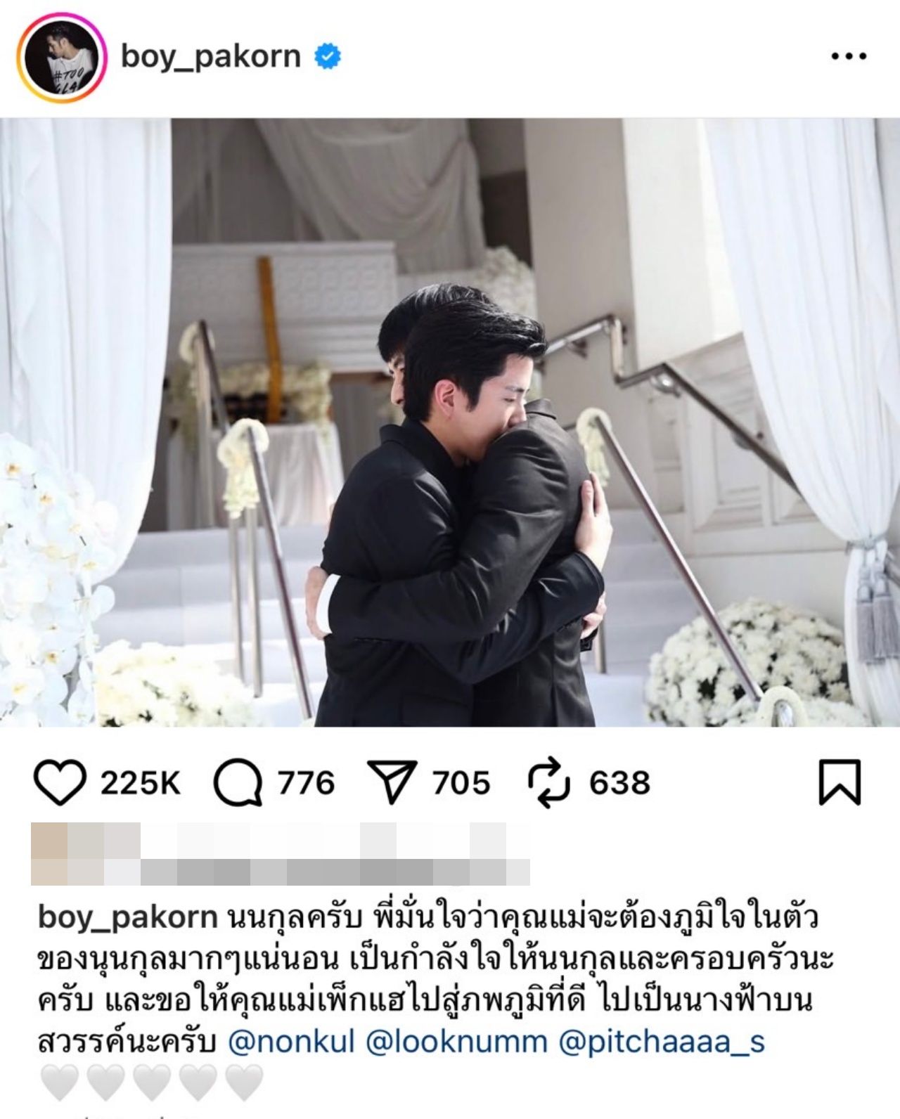 โดย บอย ได้โพสต์ขณะโอบกอดน้อง และเขียนข้อความว่า "นนกุลครับ พี่มั่นใจว่าคุณแม่จะต้องภูมิใจในตัวของนนกุลมากๆแน่นอน เป็นกำลังใจให้นนกุลและครอบครัวนะครับ และขอให้คุณแม่เพ็กแฮไปสู่ภพภูมิที่ดี ไปเป็นนางฟ้าบนสวรรค์นะครับ"