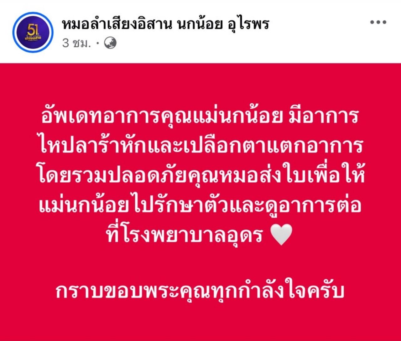 ก่อนจะโพสต์อัปเดตอาการของ แม่นกน้อย อีกครั้งว่า "อัปเดตอาการคุณแม่นกน้อย มีอาการไหปลาร้าหักและเปลือกตาแตก อาการโดยรวมปลอดภัย คุณหมอส่งใบเพื่อให้แม่นกน้อยไปรักษาตัวและดูอาการต่อที่โรงพยาบาลอุดร กราบขอบพระคุณทุกกำลังใจครับ"