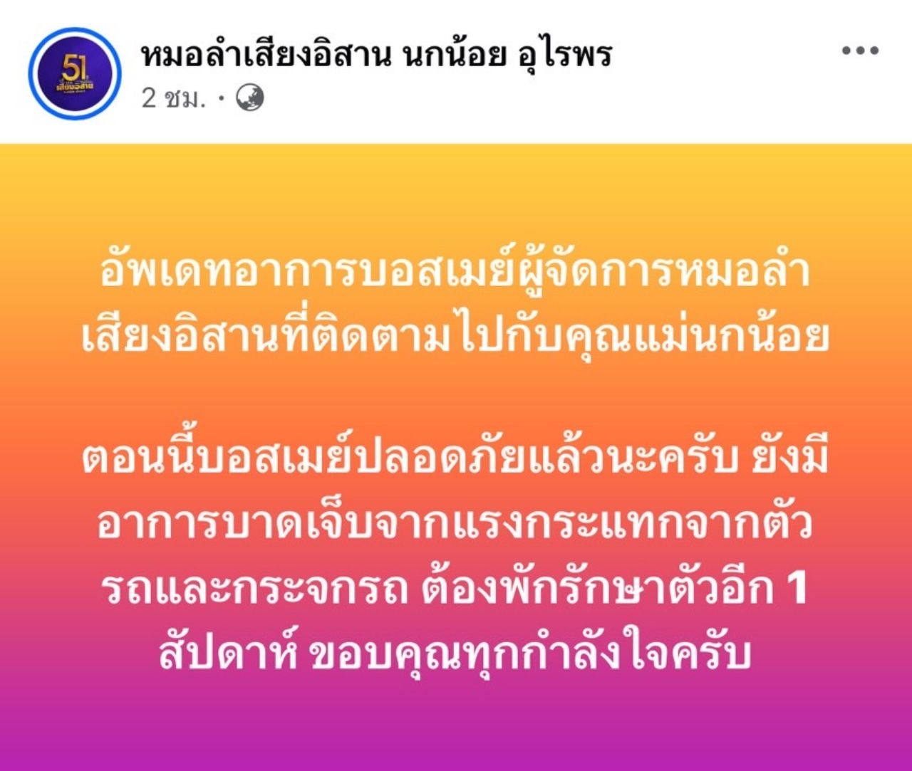 พร้อมกับโพสต์ถึงอาการของผู้จัดการวงที่ได้นั่งไปกับแม่นกน้อยด้วยว่า "อัปเดตอาการบอสเมย์ผู้จัดการหมอลำเสียงอิสานที่ติดตามไปกับคุณแม่นกน้อย ตอนนี้บอสเมย์ปลอดภัยแล้วนะครับ ยังมีอาการบาดเจ็บจากแรงกระแทกจากตัวรถและกระจกรถ ต้องพักรักษาตัวอีก 1 สัปดาห์ ขอบคุณทุกกำลังใจครับ"