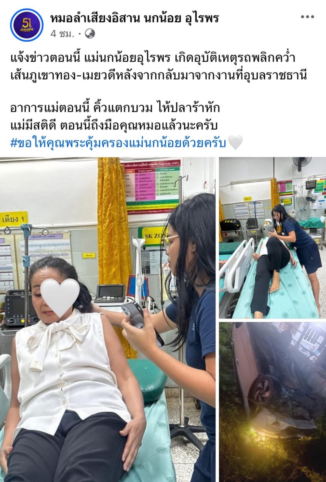 "แจ้งข่าวตอนนี้ แม่นกน้อย อุไรพร เกิดอุบัติเหตุรถพลิกคว่ำ เส้นภูเขาทอง-เมยวดีหลังจากกลับมาจากงานที่อุบลราชธานี อาการแม่ตอนนี้ คิ้วแตกบวม ไหปลาร้าหัก แม่มีสติดี ตอนนี้ถึงมือคุณหมอแล้วนะครับ #ขอให้คุณพระคุ้มครองแม่นกน้อยด้วยครับ"