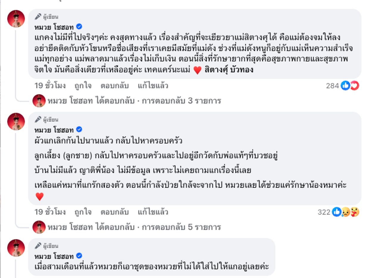 และ "แกคงไม่มีที่ไปจริงๆ ค่ะ คงสุดทางแล้ว เรื่องสำคัญที่จะเยียวยาแม่สิตางศุได้ คือแม่ต้องจมให้ลง อย่ายึดติดกับหัวโขนหรือชื่อเสียงที่เราเคยมีสมัยที่แม่ดัง ช่วงที่แม่ดังหนูก็อยู่กับแม่เห็นความสำเร็จแม่ทุกอย่าง แม่พลาดมาแล้วเรื่องไม่เก็บเงิน ตอนนี้สิ่งที่รักษายากที่สุดคือสุขภาพกายและสุขภาพจิตใจ มันคือสิ่งเดียวที่เหลืออยู่ค่ะ เทคแคร์นะแม่"