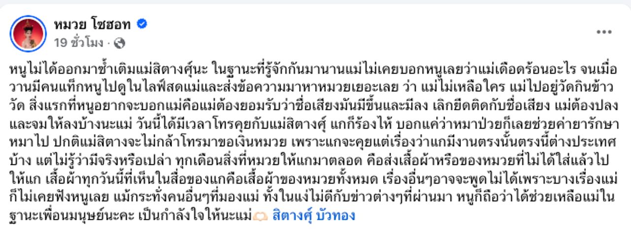 "หนูไม่ได้ออกมาซ้ำเติม นะ ในฐานะที่รู้จักกันมานานแม่ไม่เคยบอกหนูเลยว่าแม่เดือดร้อนอะไร จนเมื่อวานมีคนแท็กหนูไปดูในไลฟ์สดแม่และส่งข้อความมาหาหมวยเยอะเลย ว่าแม่ไม่เหลือใคร แม่ไปอยู่วัดกินข้าววัด