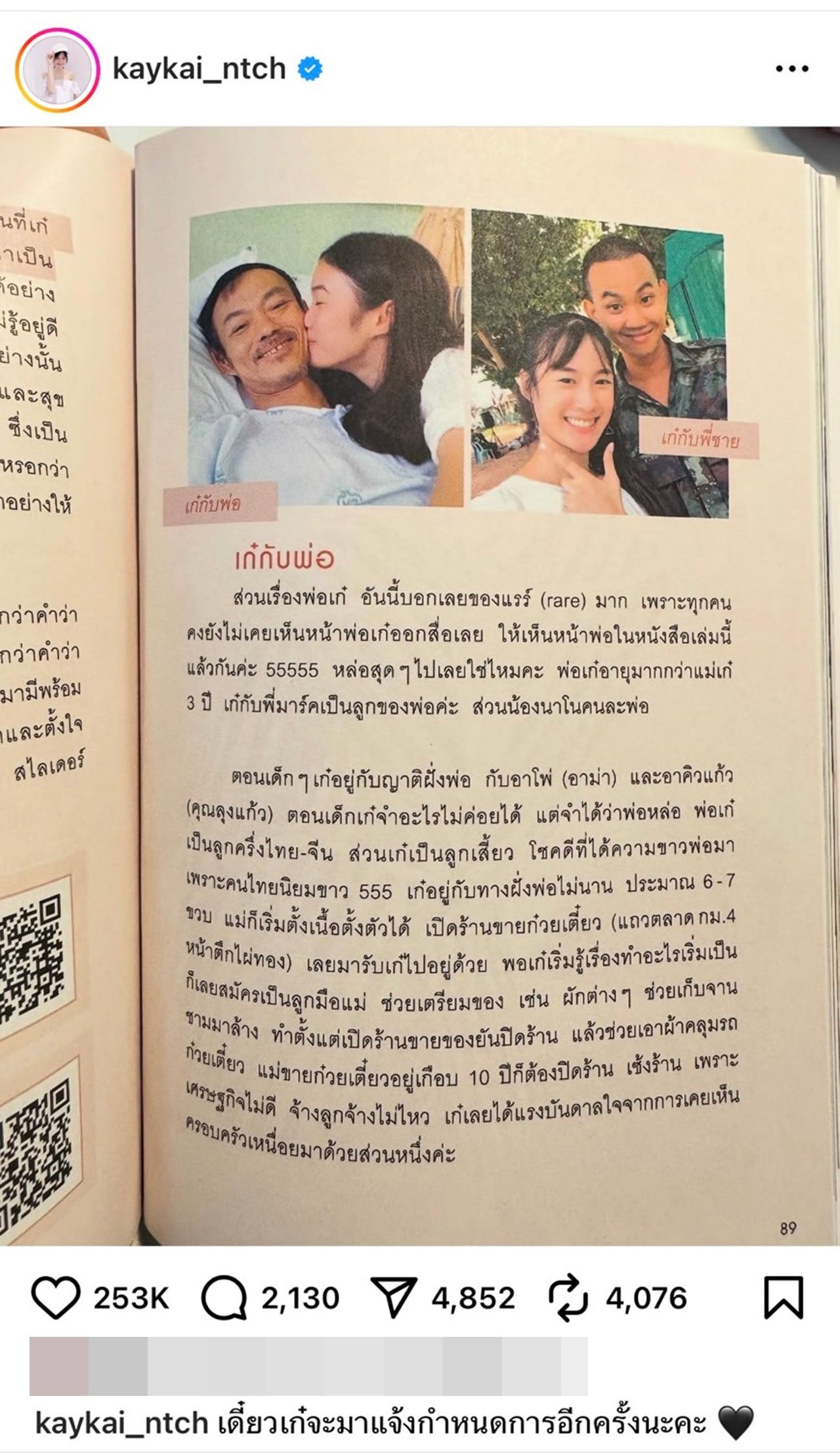 โดยในอินสตาแกรมของ เก๋ไก๋ ได้เปิดภาพความทรงจำในอดีตกับคุณพ่อ ซึ่งเป็นการสัมภาษณ์ผ่านหนังสือเล่มหนึ่ง ที่เธอได้ให้สัมภาษณ์ไว้ บอกว่า