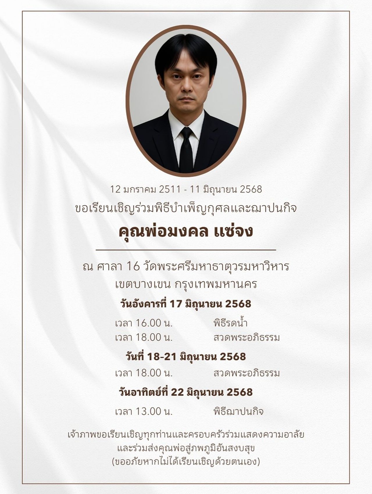 พร้อมกับเผยกำหนดการพิธีบำเพ็ญกุศลและพิธีฌาปนกิจ ซึ่งจะจัดขึ้นที่ศาลา 16 วัดพระศรีมหาธาตุวรมหาวิหาร เขตบางเขน กรุงเทพมหานคร