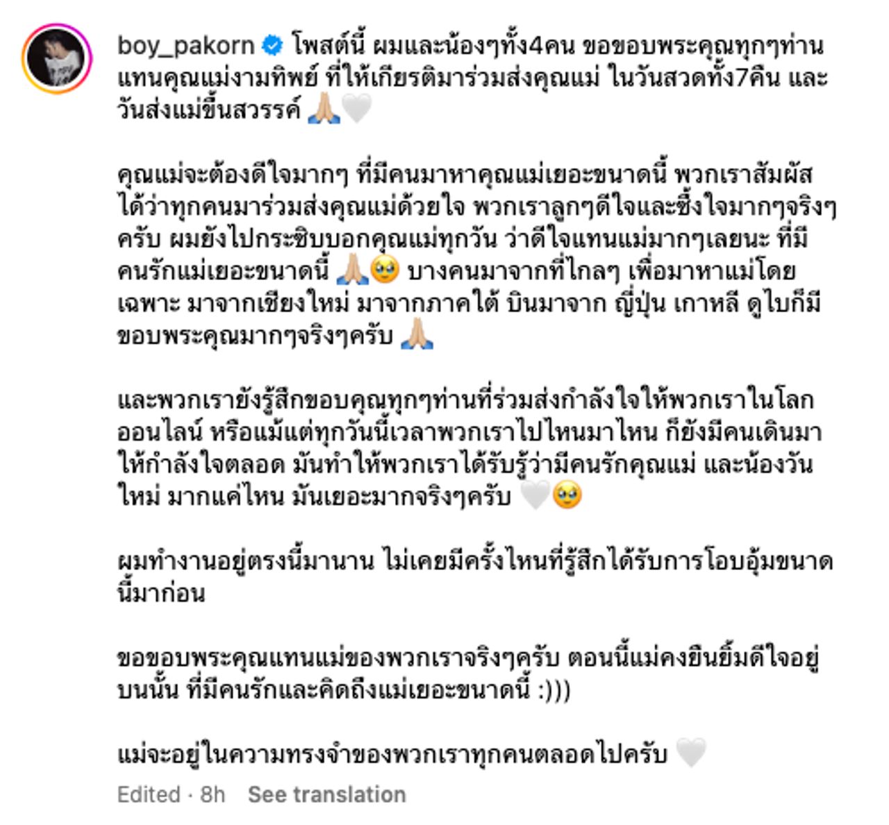 "โพสต์นี้ ผมและน้องๆ ทั้ง 4 คน ขอขอบพระคุณทุกๆ ท่านแทนคุณแม่งามทิพย์ ที่ให้เกียรติมาร่วมส่งคุณแม่ ในวันสวดทั้ง 7 คืน และวันส่งแม่ขึ้นสวรรค์