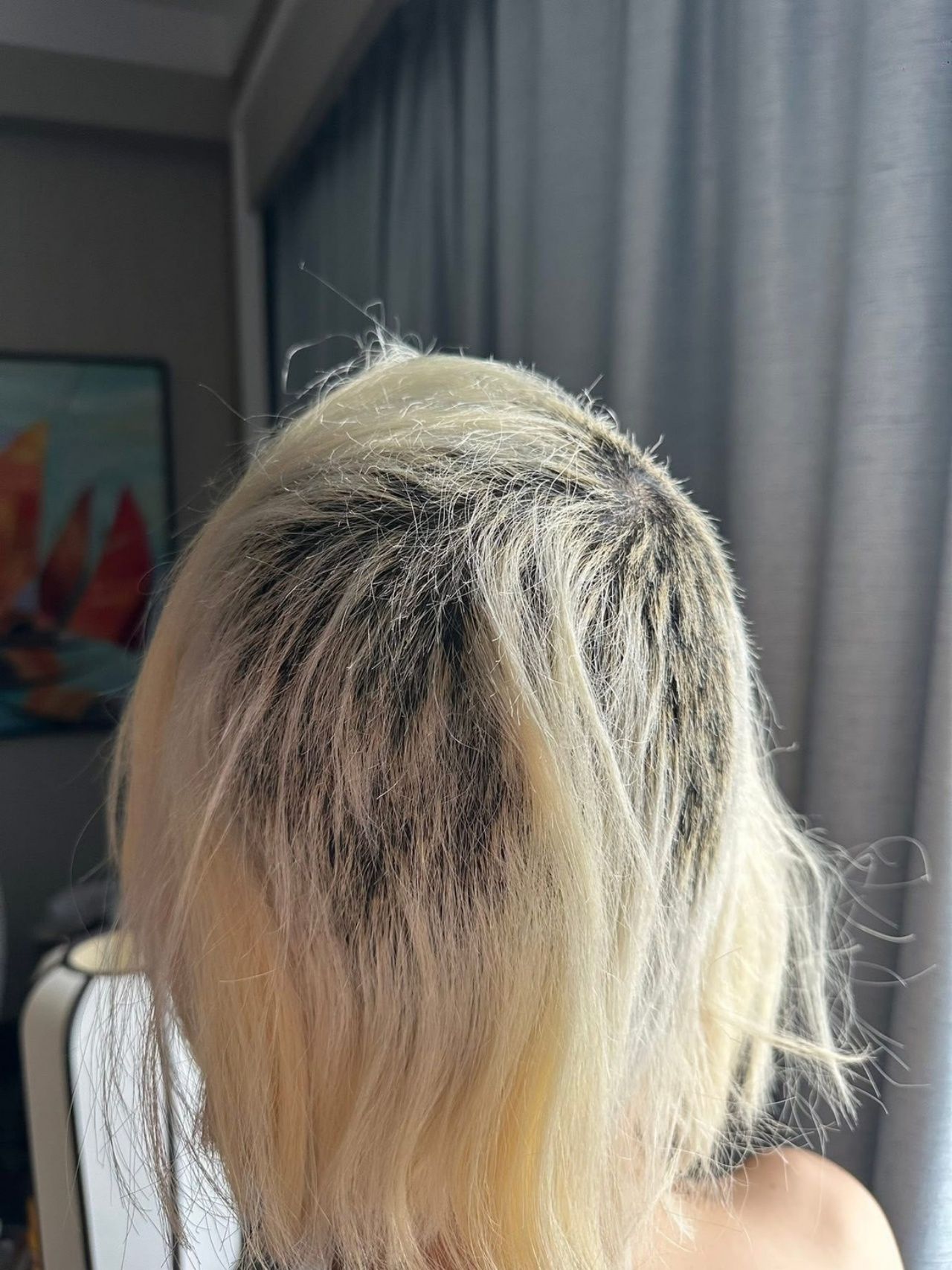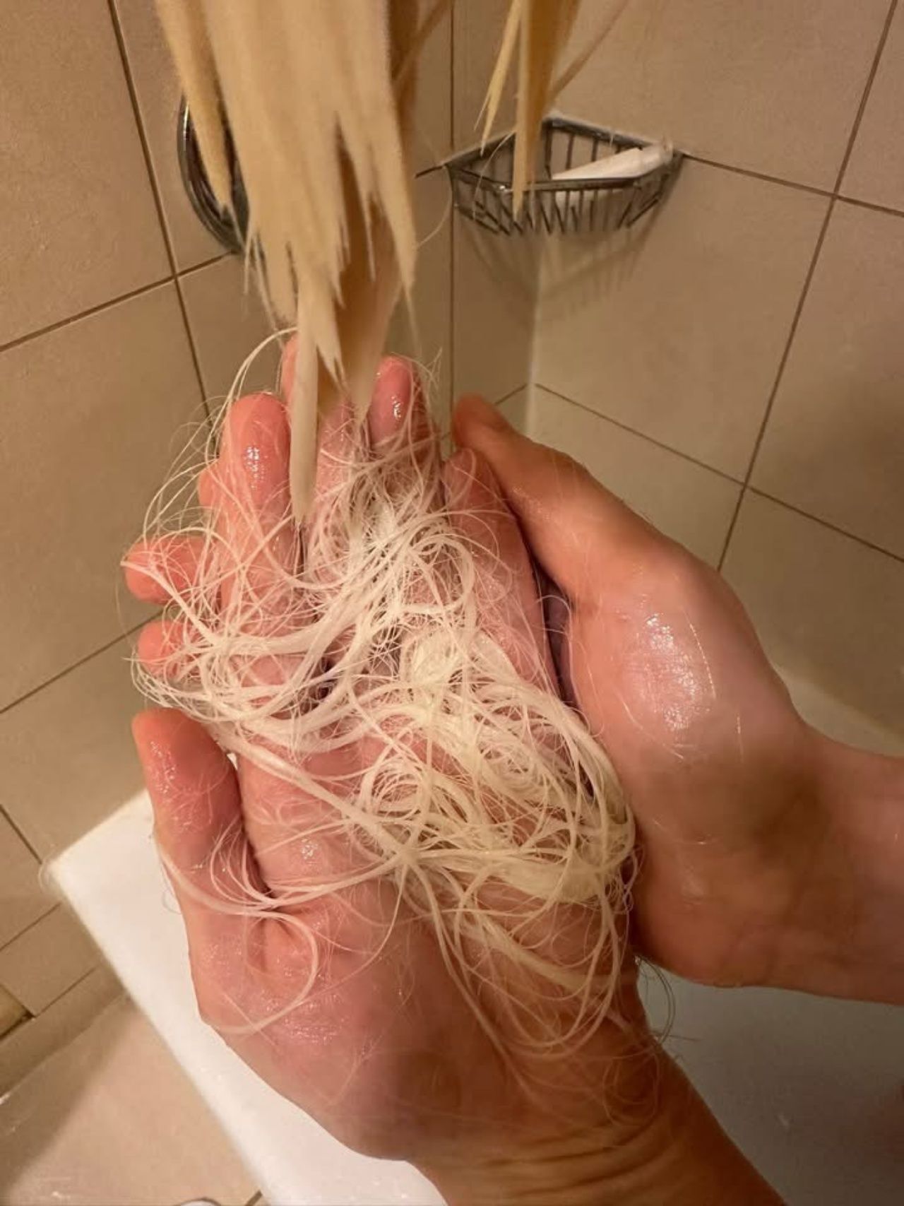 ผมร่วงเป็นกำมือทุกวัน จนนอนไม่หลับ เครียด และร้องไห้แทบทุกคืนมาตลอด 2 สัปดาห์ ล่าสุดผมที่เหลืออยู่ยาวแค่ประมาณ 3 มม. ทำให้ไม่สามารถต่อผมได้ ต้องใช้เวลานานกว่า 2 ปีกว่าจะกลับมาเหมือนเดิม และทุกครั้งที่เห็นตัวเองในกระจก หรือคลิปจากแฟน ๆ รู้สึกใจสลายมาก ไม่กล้าดูตัวเอง