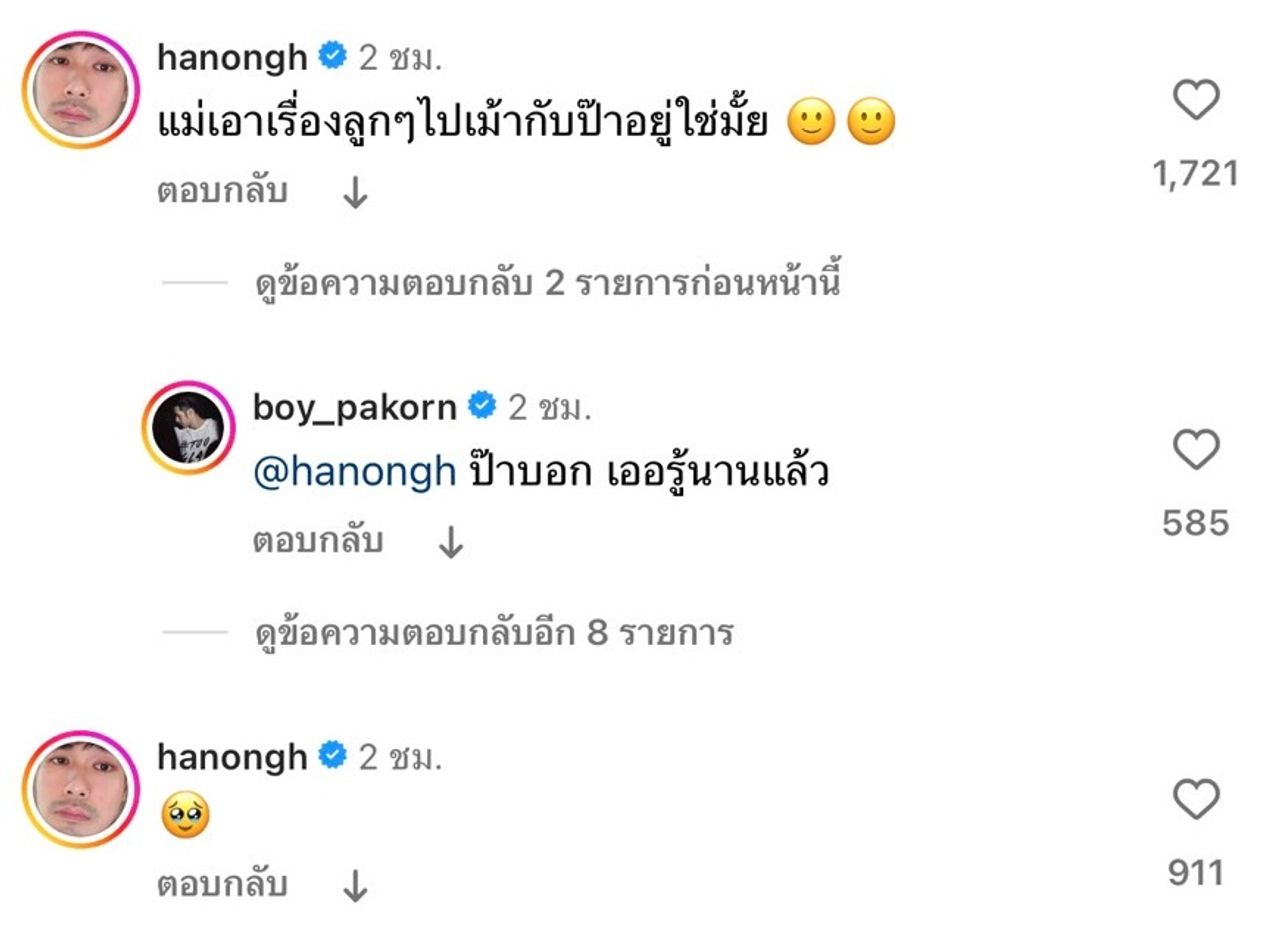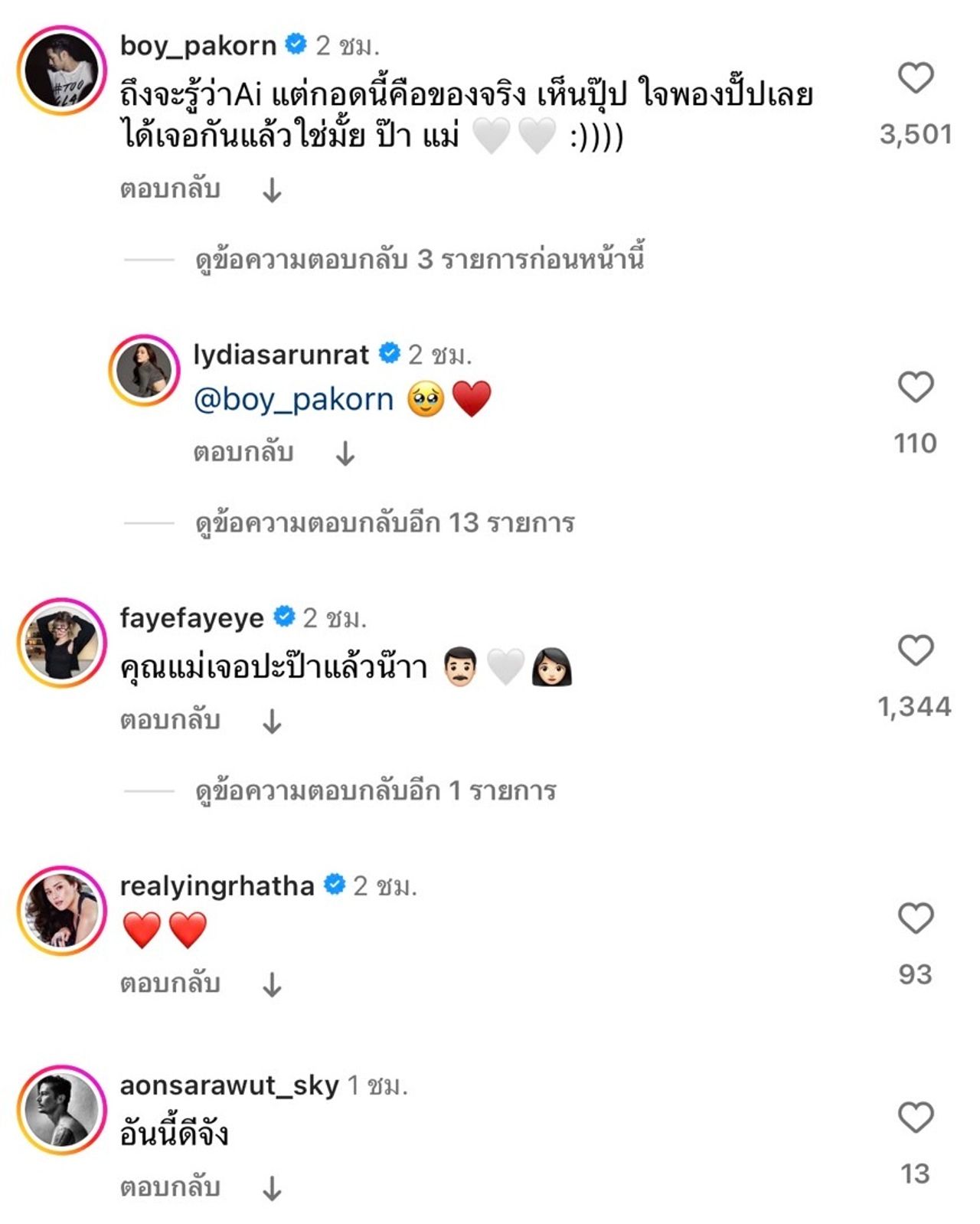 ด้าน บอย ปกรณ์ ก็คอมเมนต์ใต้โพสต์ว่า “ถึงจะรู้ว่า Ai แต่กอดนี้คือของจริง เห็นปุ๊บ ใจพองปั๊บเลย ได้เจอกันแล้วใช่มั้ย ป๊า แม่” ในขณะที่ หน่อง ธนา ก็คอมเมนต์ว่า “แม่เอาเรื่องลูกๆ ไปเม้าท์กับป๊าอยู่ใช่มั้ย”