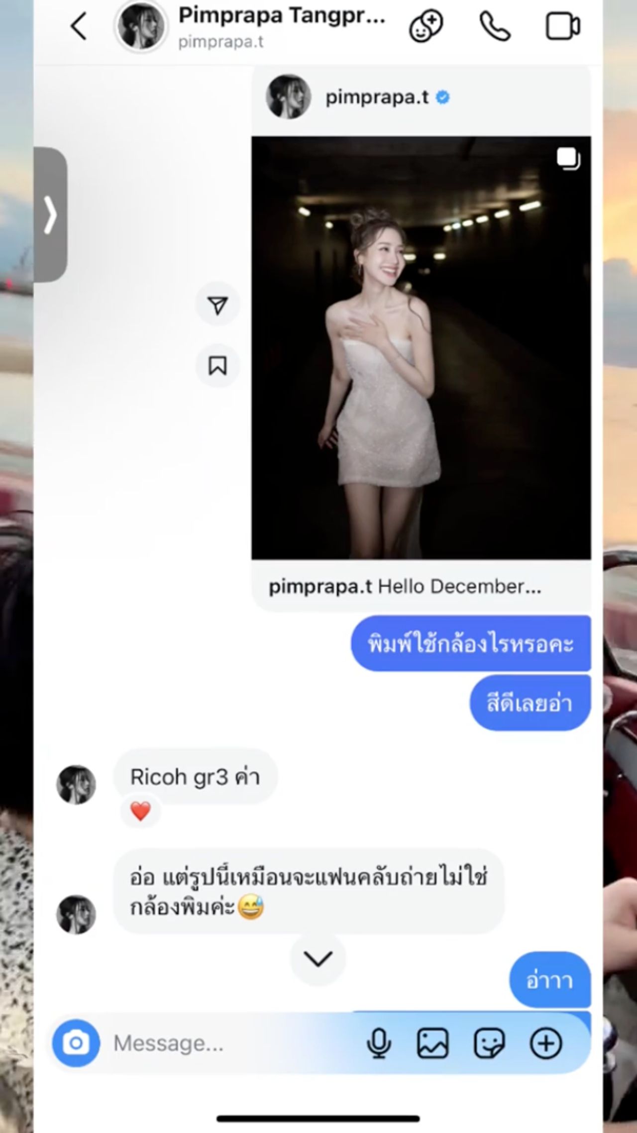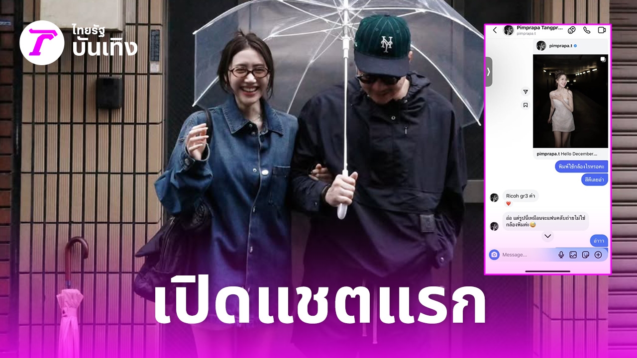 ซึ่งนอกจากจะเผยภาพคู่ที่ชวนฟินแล้ว ยังมีการเปิดเผยแชตแรกที่ฝ่ายชายเริ่มเข้ามาทักพูดคุย โดยส่งภาพจากอินสตาแกรมของพิมมาพร้อมคำถามว่า “พิมใช้กล้องอะไรถ่าย” เป็นจุดเริ่มต้นของความสัมพันธ์ที่หลายคนไม่เคยรู้