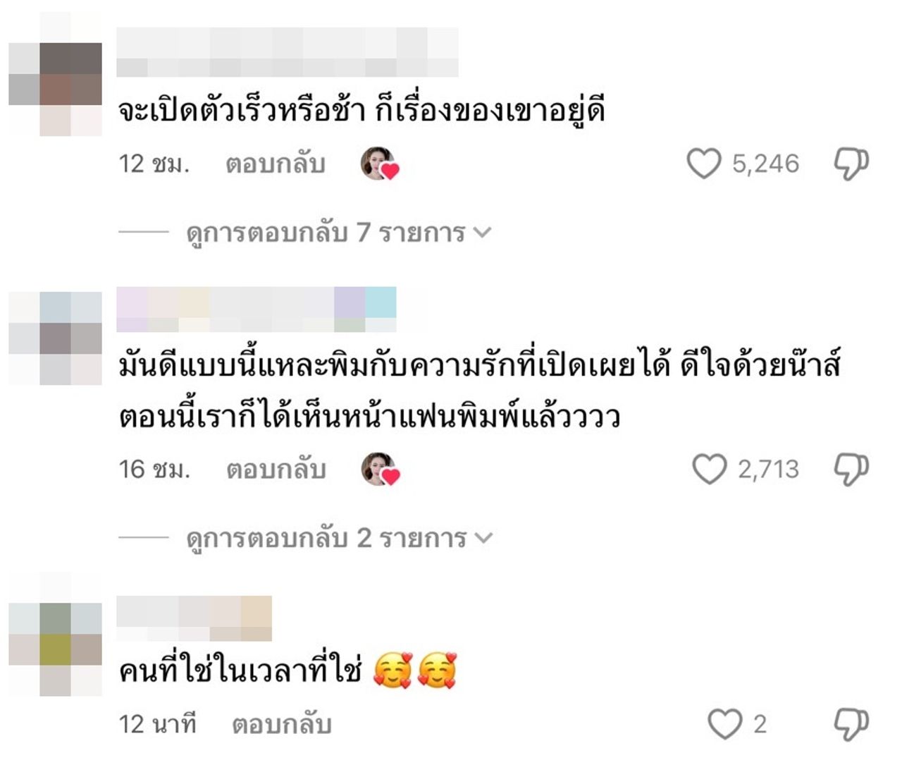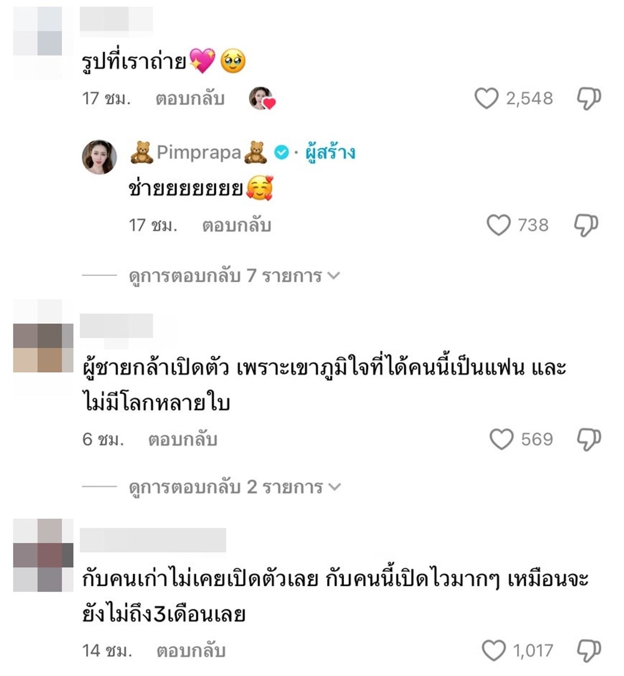 ซึ่งพิมก็ไม่ได้ตอบโต้ แต่กดไลก์คอมเมนต์จากแฟนๆ ที่ออกมาพูดแทน อาทิ จะเปิดตัวเร็วหรือช้า ก็เรื่องของเขาอยู่ดี, มันดีแบบนี้แหละพิมกับความรักที่เปิดเผยได้ ดีใจด้วยน๊าส์ ตอนนี้เราก็ได้เห็นหน้าแฟนพิมพ์แล้วววว ฯลฯ
