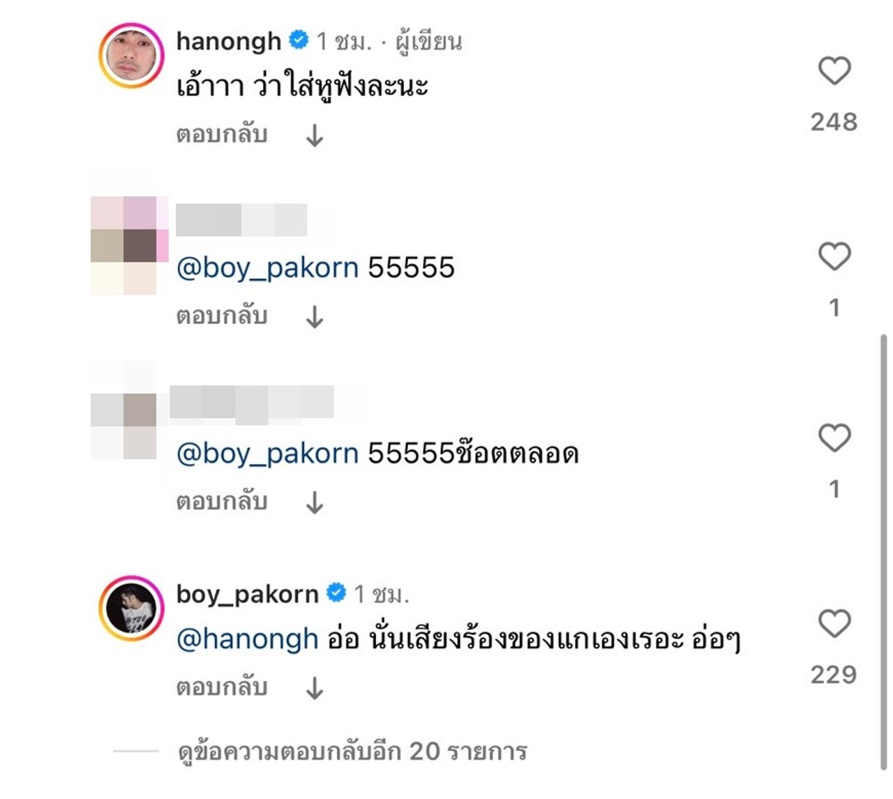 แต่งานนี้ก็เจอคอมเมนต์ช็อตฟีลจากพี่ชายคนโตอย่าง บอย ปกรณ์ ที่เข้ามาแซวว่า “ทีเมื่อคืนแกดูหนังโป๊ เสียงดังออกมานอกห้อง ข้ายังไม่ฟ้องแม่เลย” งานนี้หน่องก็รับมุก ตอบกลับไปอย่างฮาว่า “เอ้าาา ว่าใส่หูฟังละนะ” ก่อนที่บอยจะตบมุกตาม “อ่อ นั่นเสียงร้องของแกเองเรอะ อ่อๆ”