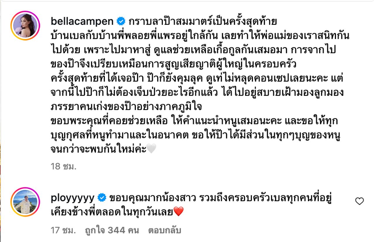 ซึ่งเบลล่าได้โพสต์ภาพพร้อมข้อความซึ้งๆ ผ่านอินสตาแกรมส่วนตัว เผยความผูกพันที่มีต่อคุณพ่อของพี่พลอย ผู้จัดการส่วนตัวคนสนิทว่า