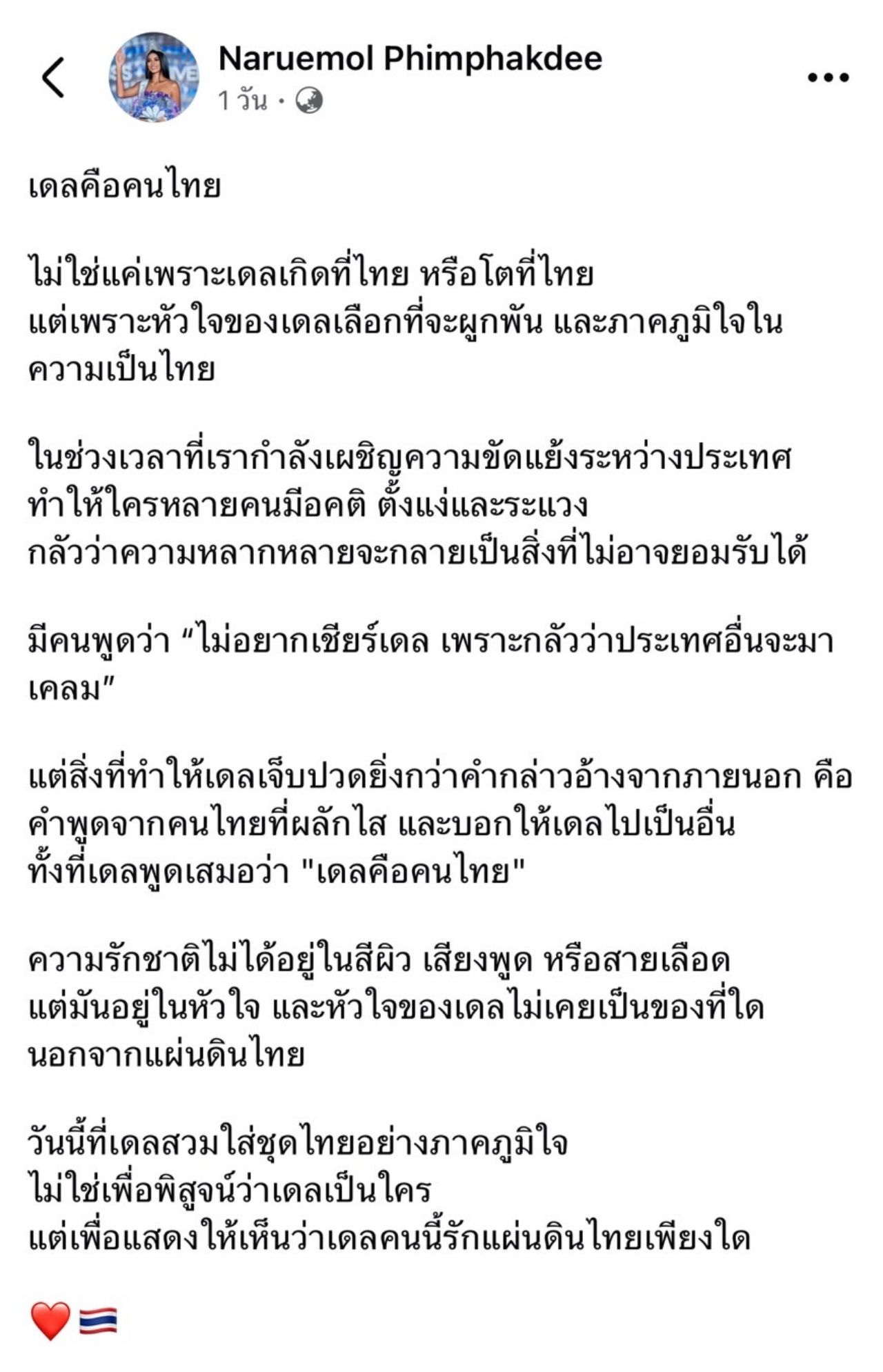 "เดลคือคนไทย ไม่ใช่แค่เพราะเดลเกิดที่ไทย หรือโตที่ไทย แต่เพราะหัวใจของเดลเลือกที่จะผูกพันและภาคภูมิใจในความเป็นไทย ในช่วงเวลาที่เรากำลังเผชิญความขัดแย้งระหว่างประเทศ ทำให้ใครหลายคนมีอคติ ตั้งแง่และระแวง กลัวว่าความหลากหลายจะกลายเป็นสิ่งที่ไม่อาจยอมรับได้