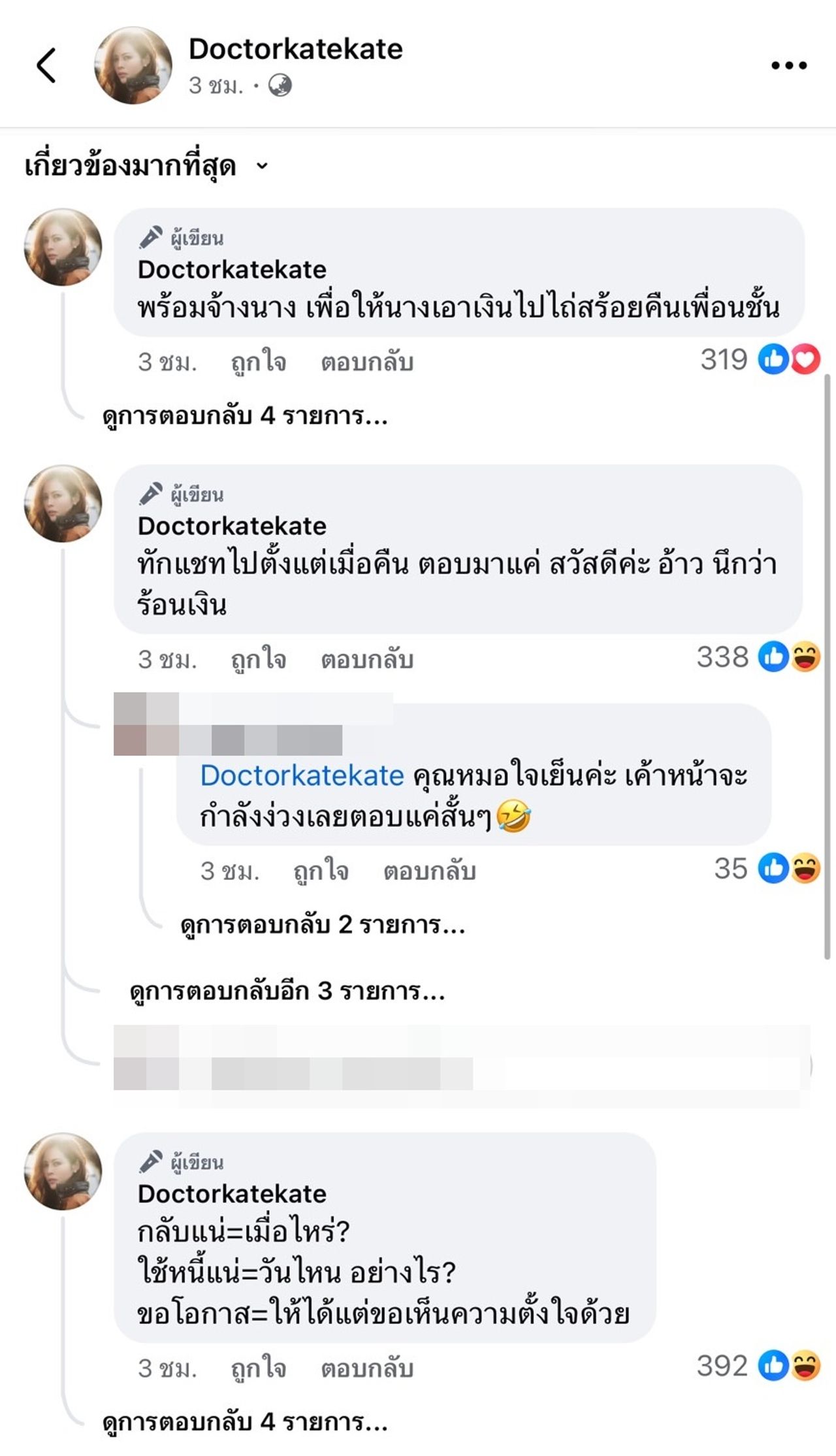 ก่อนจะคอมเมนต์เพิ่มเติมใต้โพสต์ อาทิ พร้อมจ้างนาง เพื่อให้นางเอาเงินไปไถ่สร้อยคืนเพื่อนชั้น, ทักแชทไปตั้งแต่เมื่อคืน ตอบมาแค่ สวัสดีค่ะ อ้าว นึกว่าร้อนเงิน, กลับแน่=เมื่อไหร่? ใช้หนี้แน่=วันไหน อย่างไร? ขอโอกาส=ให้ได้แต่ขอเห็นความตั้งใจด้วย