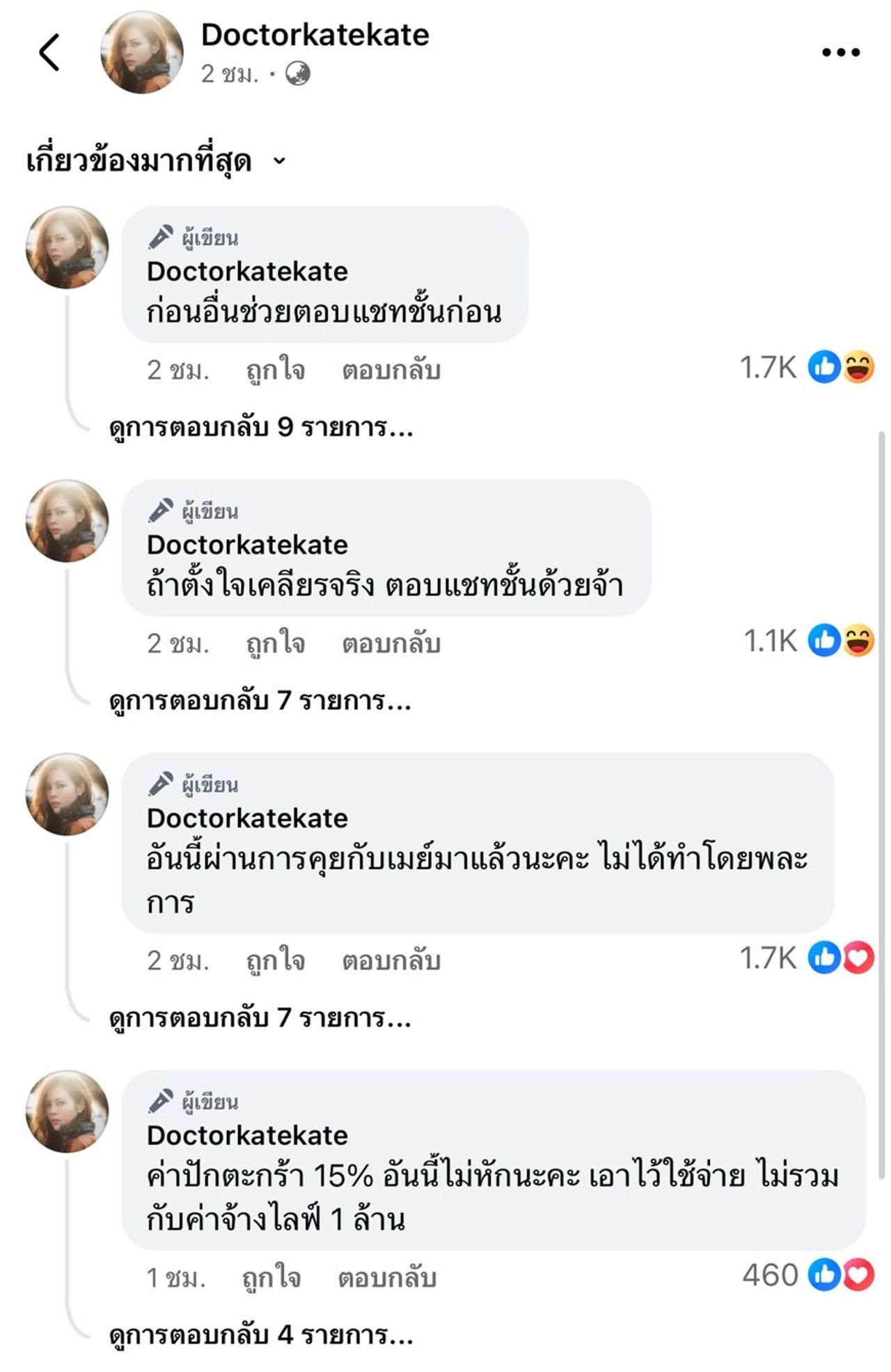 อีกทั้งคอมเมนต์เพิ่มเติมใต้โพสต์ อาทิ ก่อนอื่นช่วยตอบแชทชั้นก่อน, ถ้าตั้งใจเคลียร์จริง ตอบแชทชั้นด้วยจ้า, อันนี้ผ่านการคุยกับเมย์มาแล้วนะคะ ไม่ได้ทำโดยพละการ, ค่าปักตะกร้า 15% อันนี้ไม่หักนะคะ เอาไว้ใช้จ่าย ไม่รวมกับค่าจ้างไลฟ์ 1 ล้าน