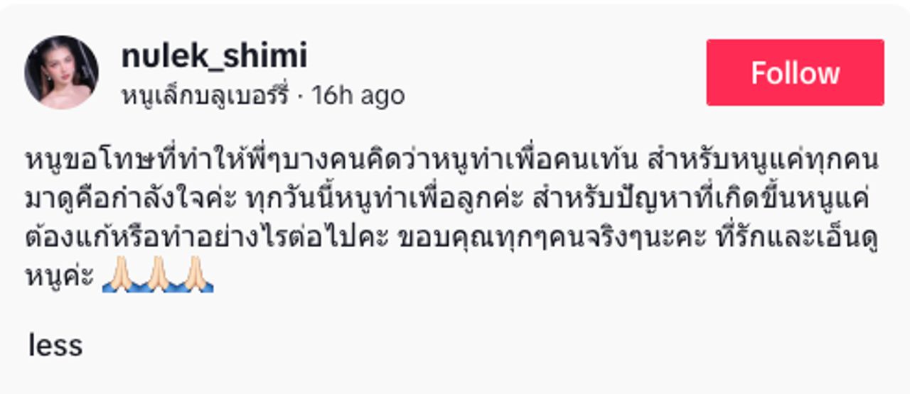 พร้อมกับเขียนแคปชั่นว่า "หนูขอโทษที่ทำให้พี่ๆ บางคนคิดว่าหนูทำเพื่อคอนเทนต์ สำหรับหนูแค่ทุกคนมาดูคือกำลังใจค่ะ ทุกวันนี้หนูทำเพื่อลูกค่ะ สำหรับปัญหาที่เกิดขึ้นหนูแค่ต้องแก้หรือทำอย่างไรต่อไปคะ ขอบคุณทุกๆ คนจริงๆ นะคะ ที่รักและเอ็นดูหนูค่ะ"