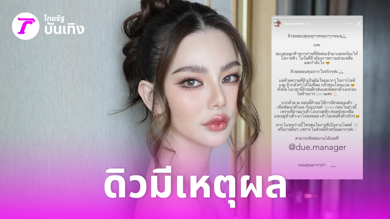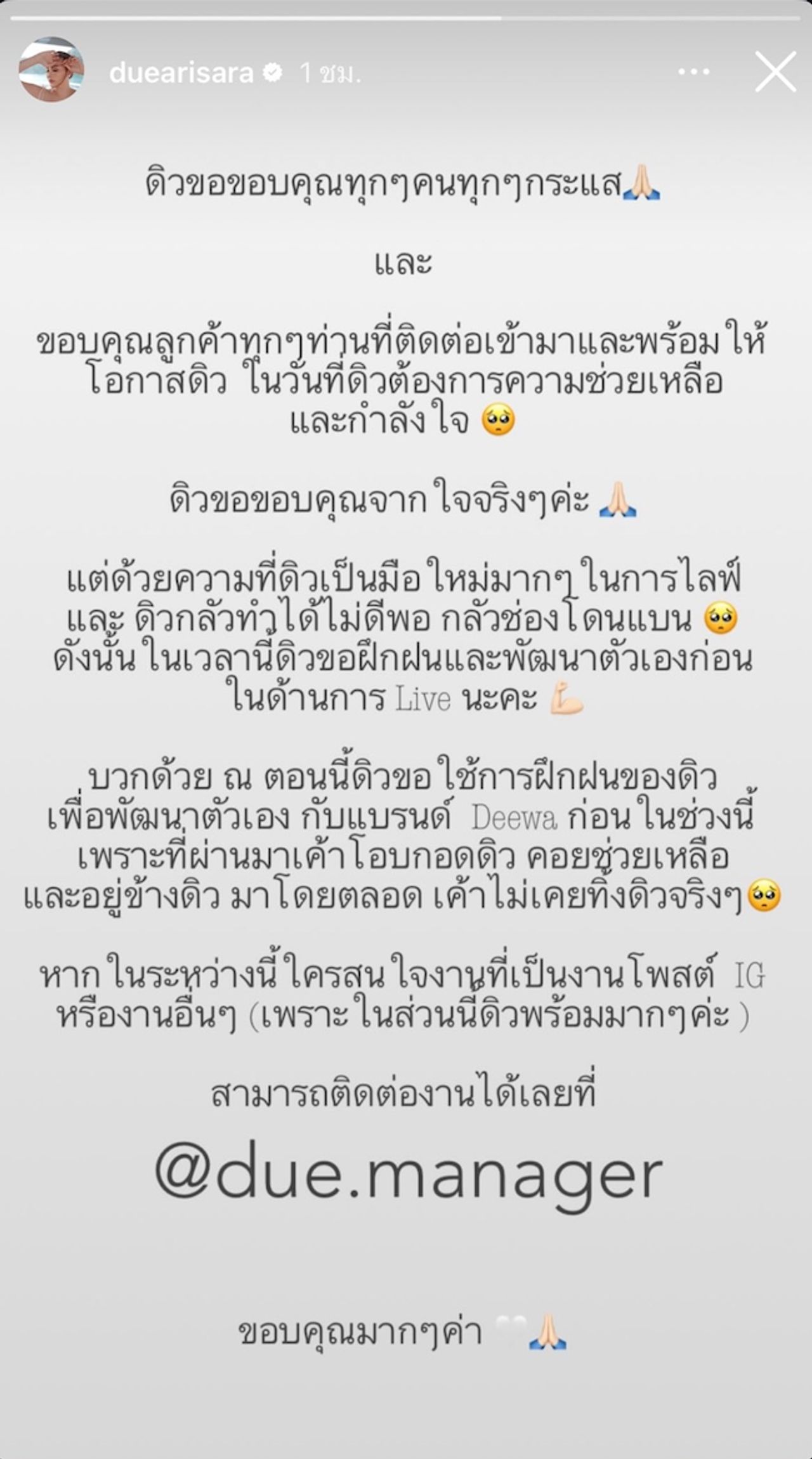 ล่าสุด ดิว อริสรา ก็ได้ออกมาโพสต์ผ่านทางไอจีสตอรี่ของตัวเอง ซึ่งดิวนั้นขอบคุณทุกๆ คนที่ให้โอกาส แต่ต้องขอปฏิเสธการรับงานไลฟ์ขายของ โดยให้เหตุผลเอาไว้ว่า