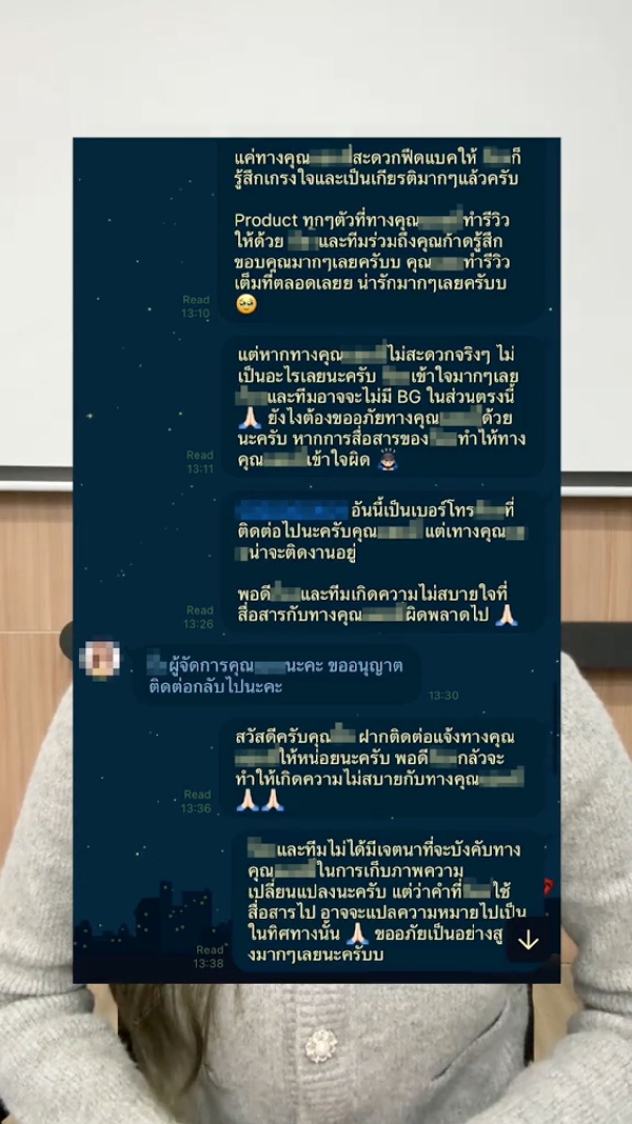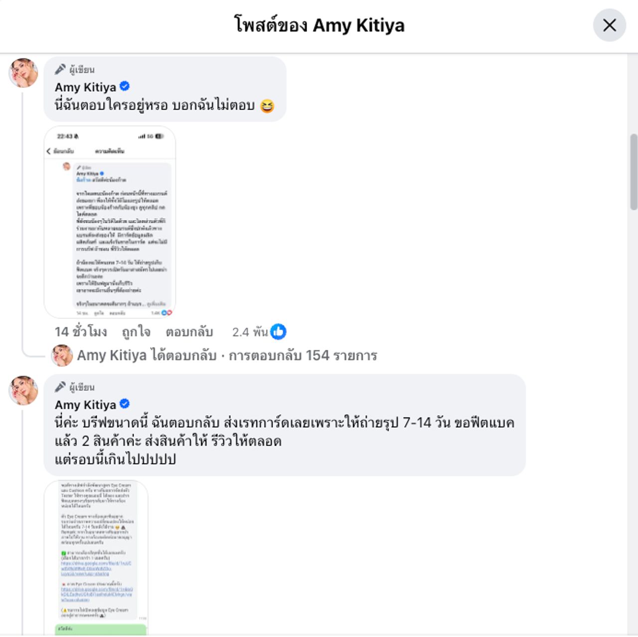 - ส่วนเรื่องที่ไม่ได้ตอบกลับ แอมมี่บอกว่าได้ตอบกลับทางแบรนด์และซ้อก้าดในคอมเมนต์แล้ว ส่วนช่องทางอื่นๆ ยังไม่ได้ตอบเพราะไม่สะดวก ตอนที่เขาพิมพ์มา ตอนนั้นต่อขนตาอยู่ แล้วไม่ได้เปิด แล้วตอนนั้นต้องเตรียมตัวพาน้องๆ แอดมินมาเที่ยวจีน ต้องแพ็กของ ปิดยอด สรุปทุกอย่างในบริษัทให้จบ แต่ตนมาตอบกลับในเพจแล้ว ทุกคนก็เห็นว่าตอบ จะบอกว่าไม่ตอบได้ยังไง