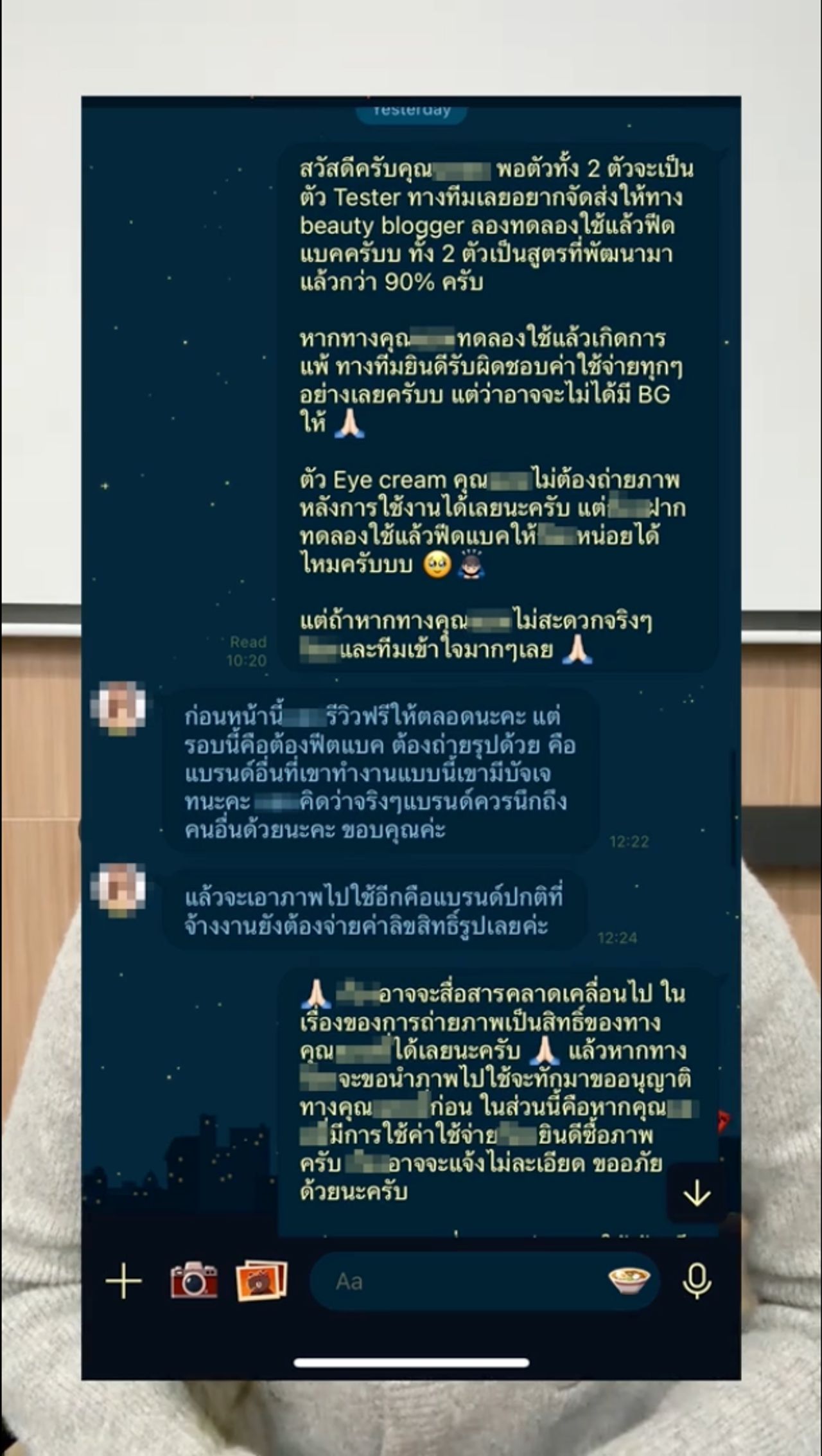 - จริงๆ ไม่ใช่แค่ตนคนเดียวที่โดน เพราะหลังจากโพสต์เรื่องนี้ก็มีทั้งอินฟูตัวเล็กตัวใหญ่ทักมาหาว่าให้โพสต์ฟรีตลอด แล้วยังแจ้งเรื่องไทม์ไลน์วันโพสต์ แต่พอตนออกมาพูดแบบตรงๆ คุณควรกลับไปพิจารณาการทำงาน ว่าการให้เกียรติคนอื่นมันก็ดี ขอโทษก็ขอโทษให้มันจริงใจ