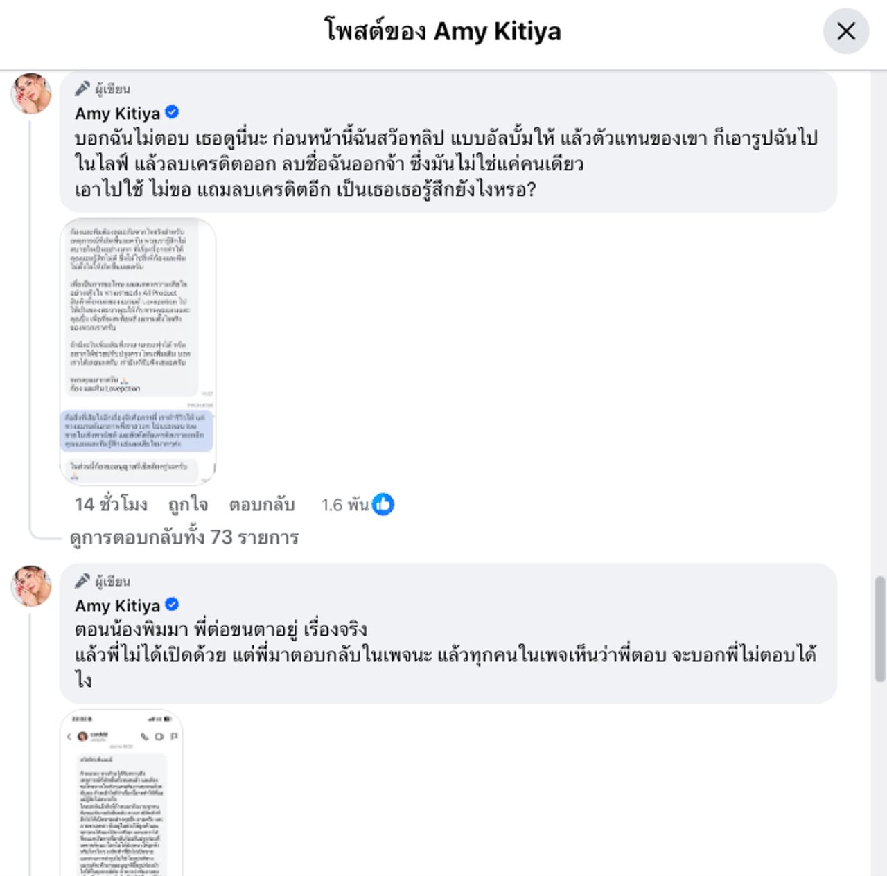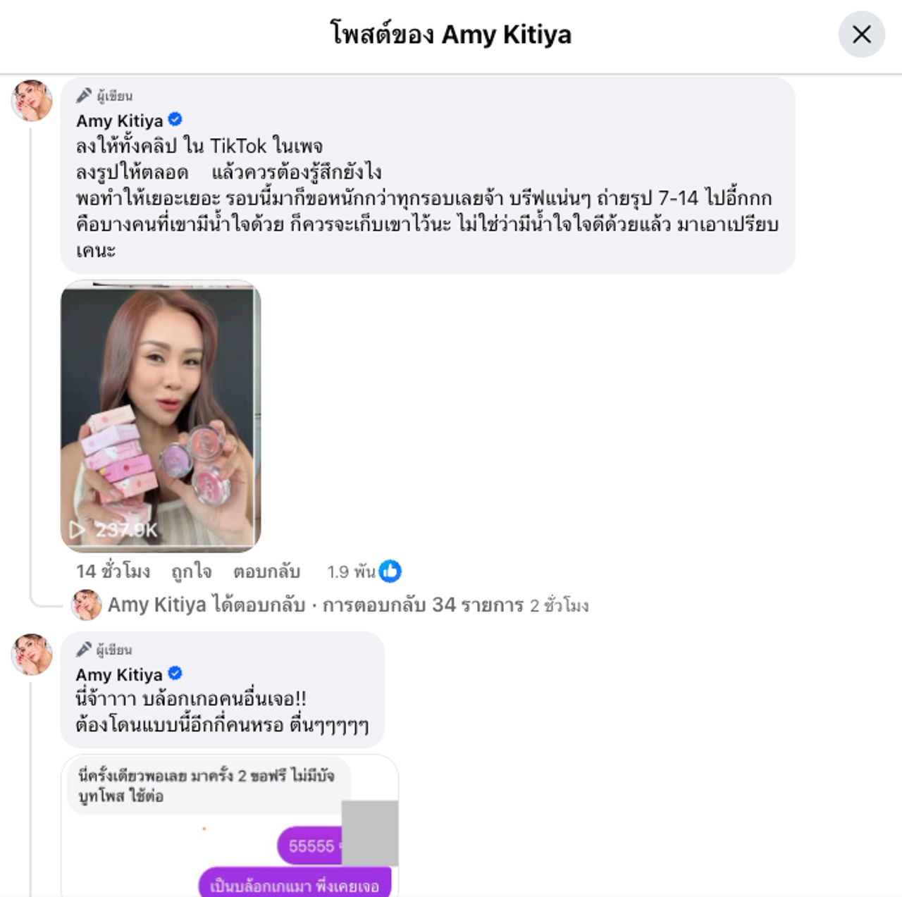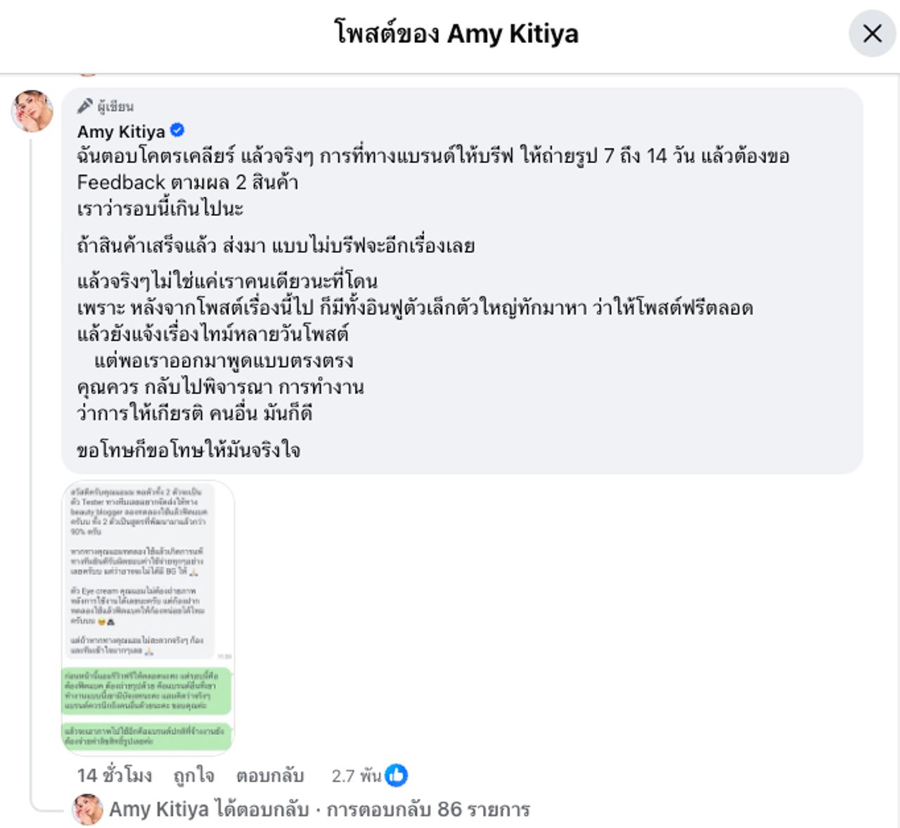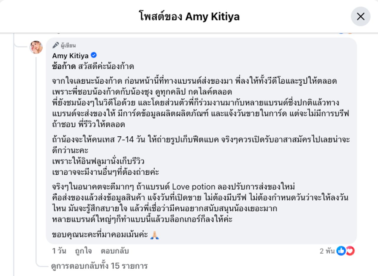 - หลังจากนั้น แอมมี่ กิตติยา ก็โต้กลับทั้งโพสต์ในเฟซบุ๊กและอัดคลิปชี้แจง ทั้งเรื่องรีวิวฟรีให้ตลอด เคยได้ของจากแบรนด์และรีวิวให้เสมอผ่านทางช่องทางต่างๆ ไม่เคยเรียกค่าจ้าง แต่รอบล่าสุดที่ให้ถ่ายรูป 7-14 วัน ขอฟีดแบ็กสินค้า รอบนี้เกินไป ถ้าสินค้าเสร็จแล้วส่งมาแบบไม่มีบรีฟจะเป็นอีกเรื่อง