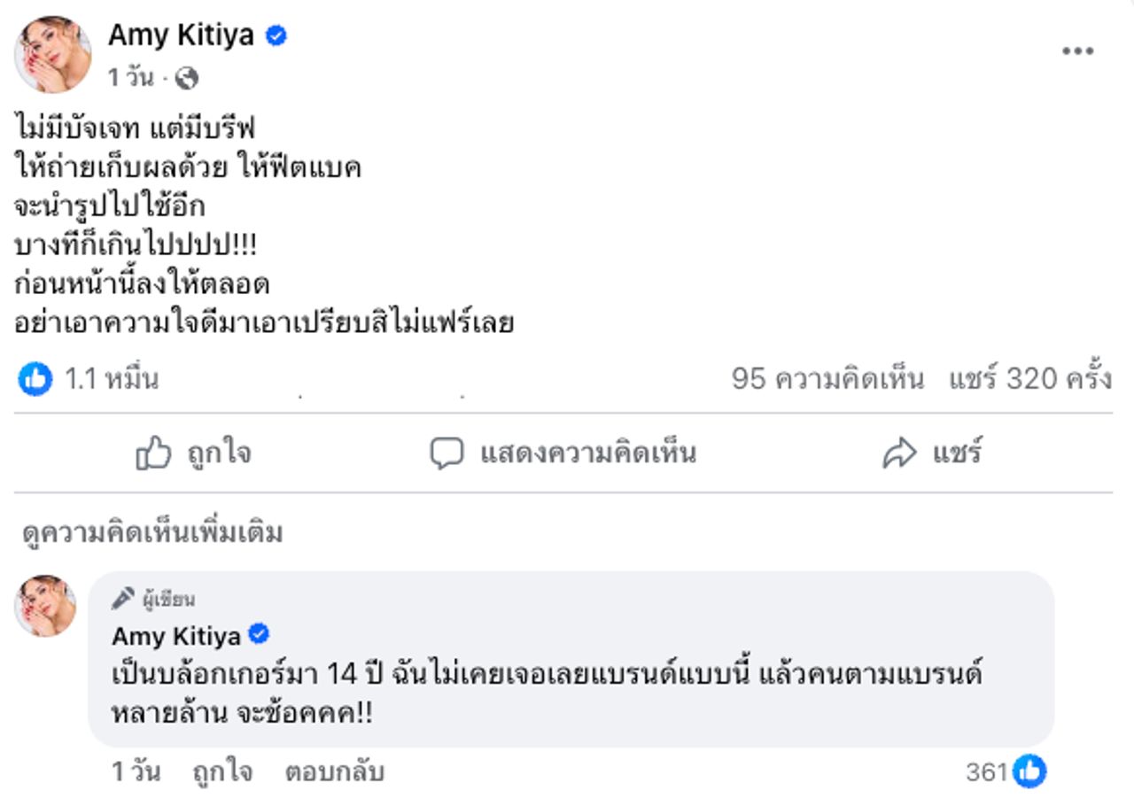 - แอมมี่ กิตติยา โพสต์เดือดเรื่องเจอคนบรีฟงานจากแบรนด์หนึ่งที่ไม่ได้จ้าง แต่ให้ถ่ายรีวิวสินค้าที่ส่งมาให้ทดลองใช้ ทั้งขอเก็บผลลัพธ์ ถ่ายรูป เขียนฟีดแบ็กสินค้า แถมระบุว่าทางแบรนด์จะนำภาพไปใช้ต่อ แต่ไม่มีการพูดคุยที่ชัดเจน เรียกว่าไม่มีบัตเจตแต่มีบรีฟ ทำให้รู้สึกว่าไม่แฟร์