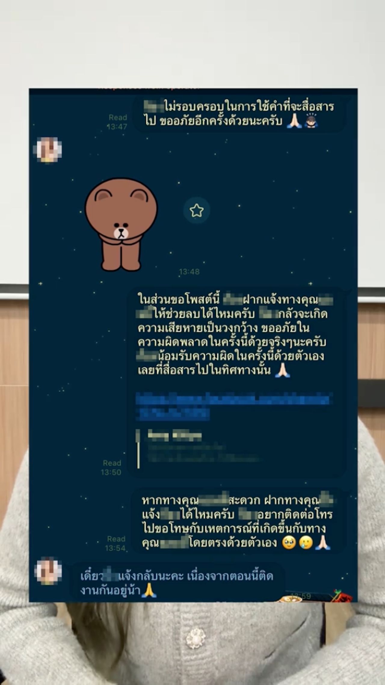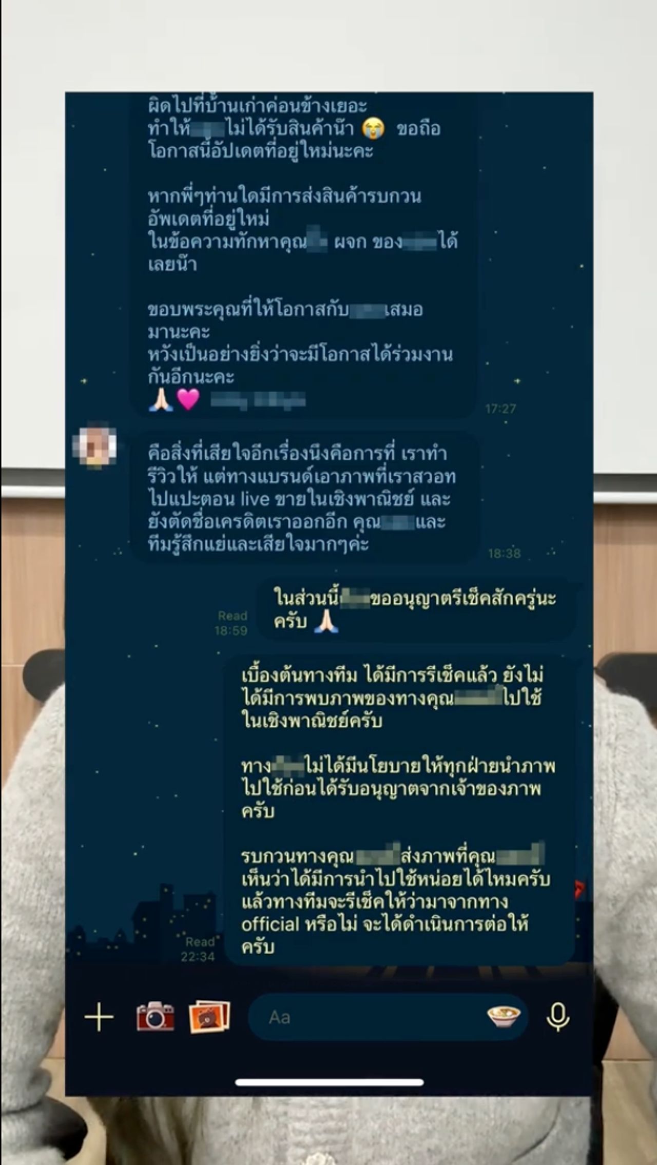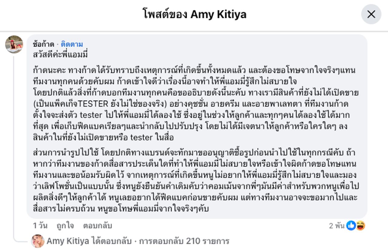 - อีกทั้งบอกว่าการส่งสินค้าไปให้ใช้ ไม่ได้มีเจตนาให้ลูกค้าหรือใครลงสินค้าที่ยังไม่เปิดขายในสื่อ ส่วนการนำรูปไปใช้ โดยปกติทางแบรนด์จะทักมาขออนุญาตซื้อรูปก่อนนำไปใช้ในทุกกรณี ถ้าหากทีมงานสื่อสารประเด็นใดที่ทำให้ไม่สบายใจ หรือเข้าใจผิด ตนขอโทษแทนทีมงาน และขอน้อมรับผิดไว้ ยืนยันคำเดิมว่าคอมเมนต์จากพี่ๆ มีค่าสำหรับพวกตนเพื่อไปผลิตสิ่งดีๆ ให้ลูกค้า เลยอยากได้ฟีดแบ็กก่อนขาย แต่ทางทีมงานอาจจะขอมากไปและสื่อสารไม่ครบถ้วน ซึ่งตนต้องขอโทษจากใจ