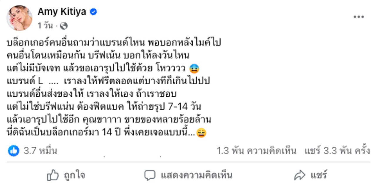 - จากนั้นแอมมี่โพสต์บอกว่า มีบล็อกเกอร์คนอื่นถามว่าแบรนด์ไหน เพราะมีคนโดนเหมือนกัน ก่อนจะระบุว่าเป็นแบรนด์ L ที่เคยลงให้ฟรี เป็นแบรนด์ที่ขายของหลายร้อยล้านบาท แบรนด์อื่นส่งของให้ เราลงเองถ้าชอบ แต่ไม่ใช่บรีฟแน่น ต้องฟีดแบ็ก ถ่ายรูป 7-14 วัน แล้วเอารูปไปใช้อีก อีกทั้งปิดท้ายว่าเป็นบล็อกเกอร์มา 14 ปี เพิ่งเคยเจอแบบนี้