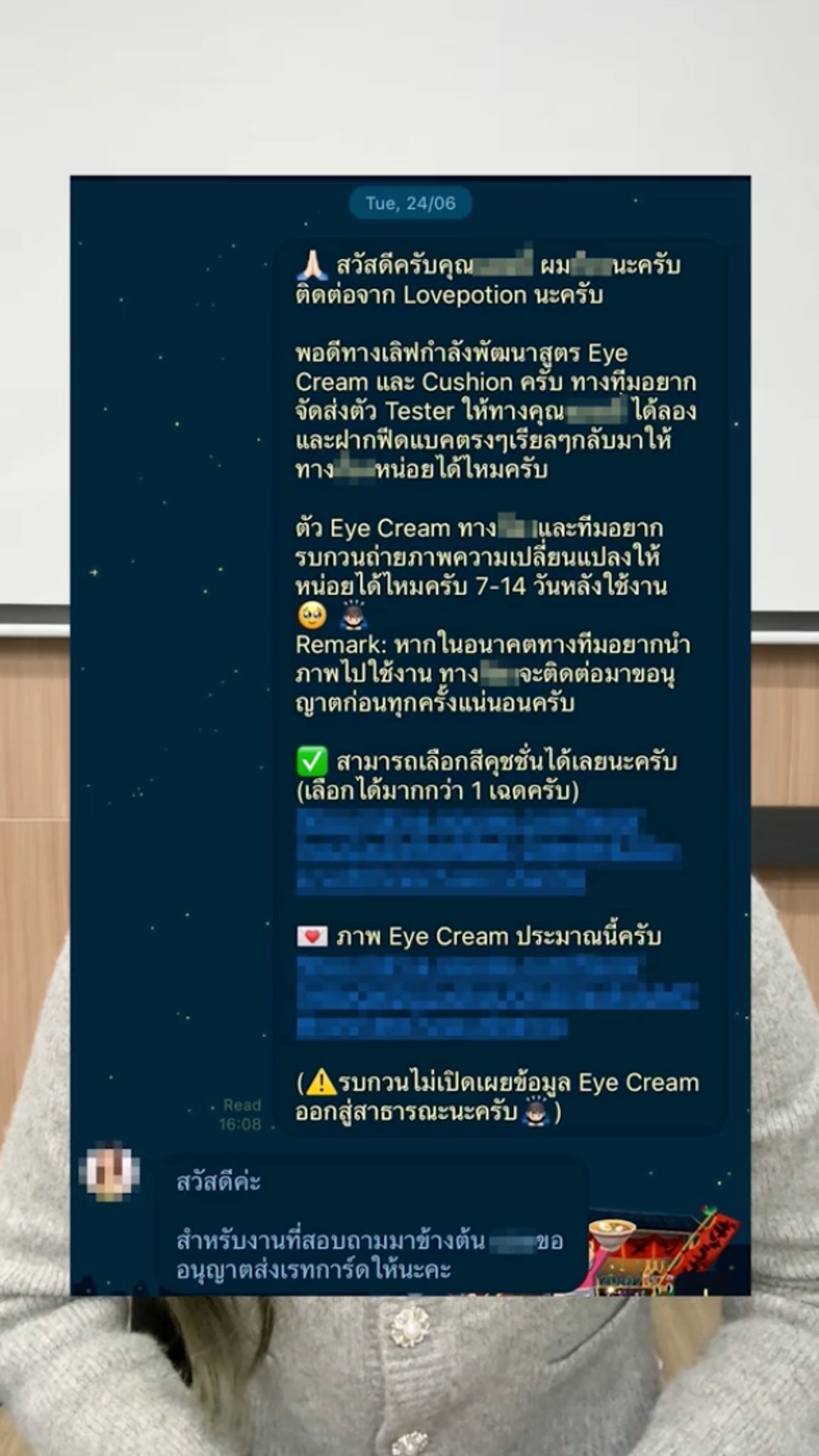 - แนะนำว่าถ้าจะให้คนเทสต์ 7-14 วัน ถ่ายรูปเก็บฟีดแบ็ก ควรเปิดรับอาสาสมัครไปเลยดีกว่า ก่อนจะแนะนำให้แบรนด์ Love Potion ปรับการส่งของใหม่ คือส่งของแล้วส่งข้อมูลสินค้า วันที่วางขาย โดยไม่ต้องมีบรีฟ ไม่ต้องกำหนดว่าจะลงวันไหน ทำให้สบายใจ และหลายแบรนด์ใหญ่ๆ ทำแบบนี้