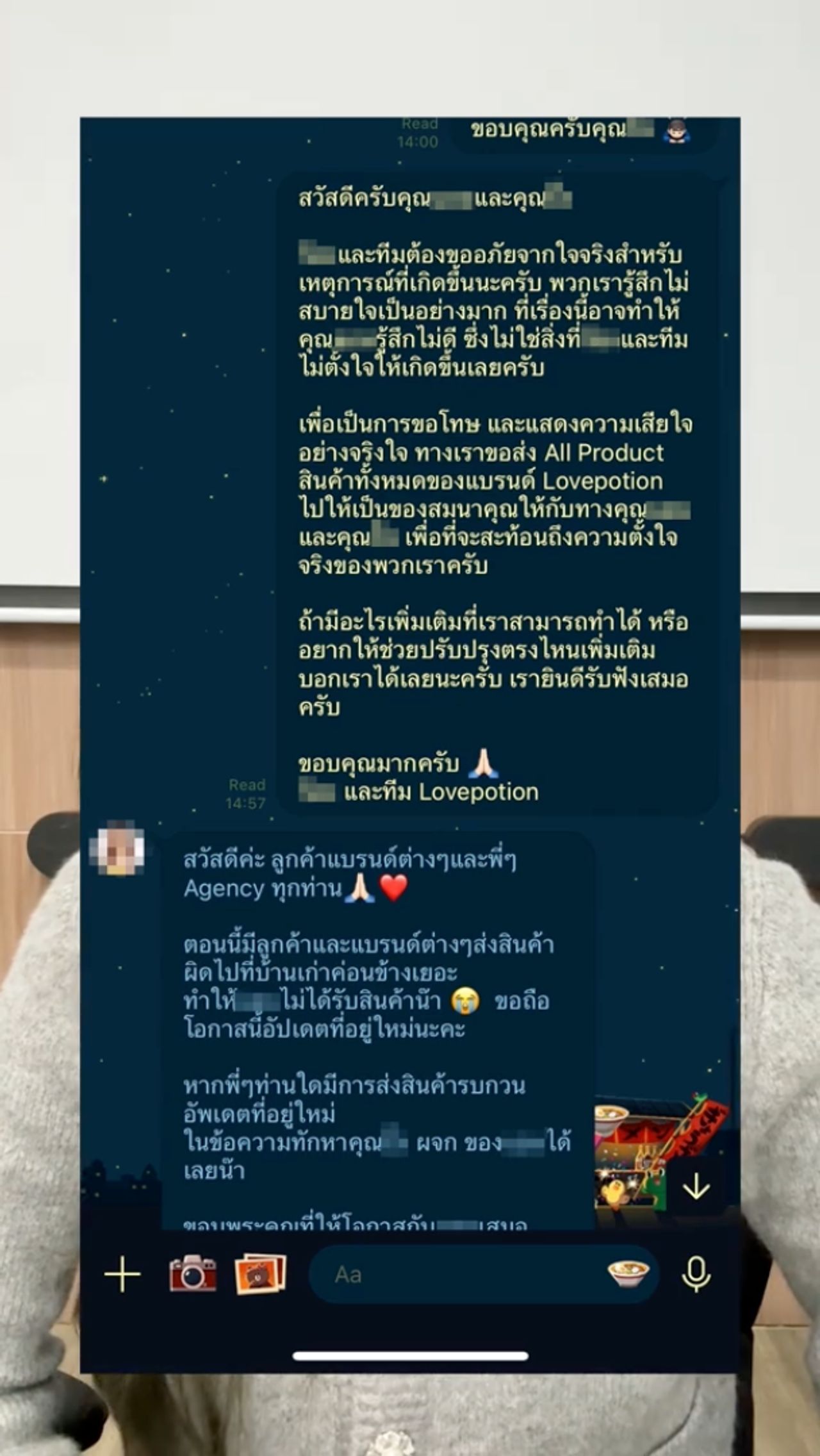 - หลังจากนั้นทางเขาก็เลือกที่จะไม่ตอบกลับทางเราทุกช่องทาง ไม่ว่าจะเป็นทีมงานก้าด ทางออฟฟิเชียล ตัวก้าดเอง หรือแม้กระทั่งการโทร ทางเราพร้อมที่จะแก้ปัญหาและเทกแอ็กชั่นให้ไวที่สุด ก้าดและ Love Potion ยังยืนยันเสมอว่าเราพร้อมรับฟังทุกความคิดเห็น พร้อมที่จะปรับปรุง แก้ไข พัฒนาให้ดียิ่งขึ้น (ชมคลิป)