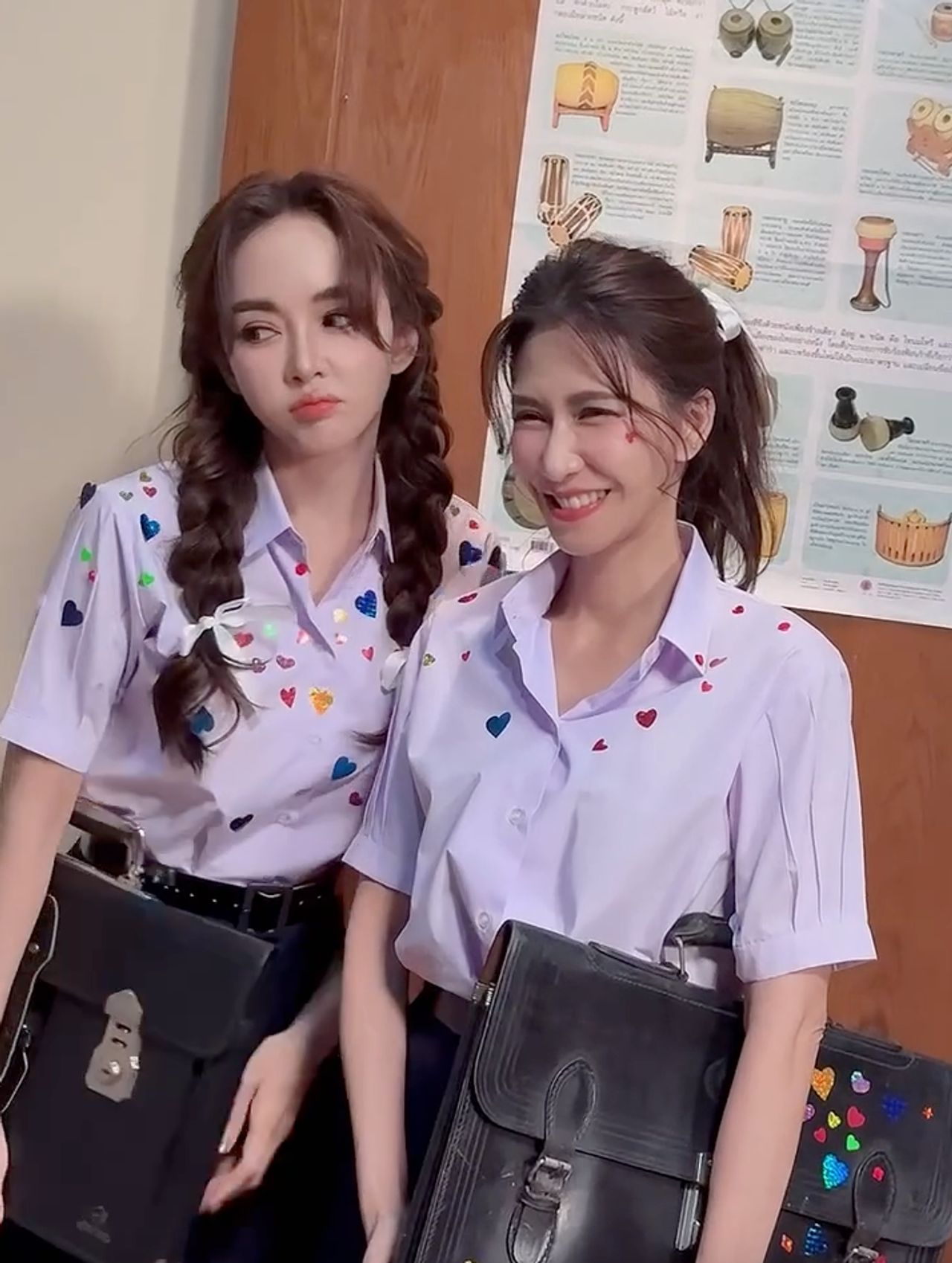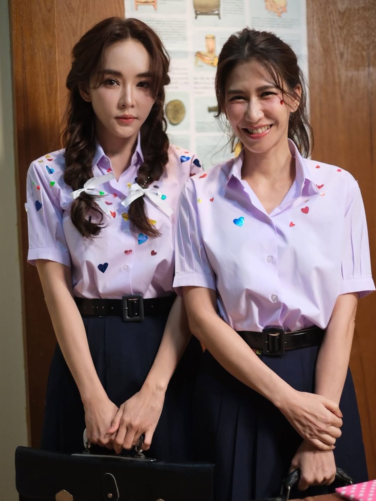 ภาพเบื้องหลังที่ถูกปล่อยผ่านทางอินสตาแกรมเผยให้เห็นความน่ารักสดใสของ ป๊อกและเป้ยที่ดูกลมกลืนไปกับชุดที่แต่งได้อย่างไม่น่าเชื่อ แถม 2 สาวยังเพิ่มความกุ๊กกิ๊กด้วยการติดสติกเกอร์รูปหัวใจบนเสื้อนักเรียน ทำให้ภาพนี้แฟนๆ เข้ามากดไลก์และคอมเมนต์แซวในความหน้าเด็กของทั้งคู่อย่างล้นหลาม ซึ่งใครจะรู้ว่า ป๊อก ปิยธิดา นั้นปัจจุบันอายุ 50 ปี ส่วน เป้ย ปานวาด ก็อายุ 45 ปี เรียกว่าป๊อกเป้ยหน้าโกงอายุแบบสุดๆ