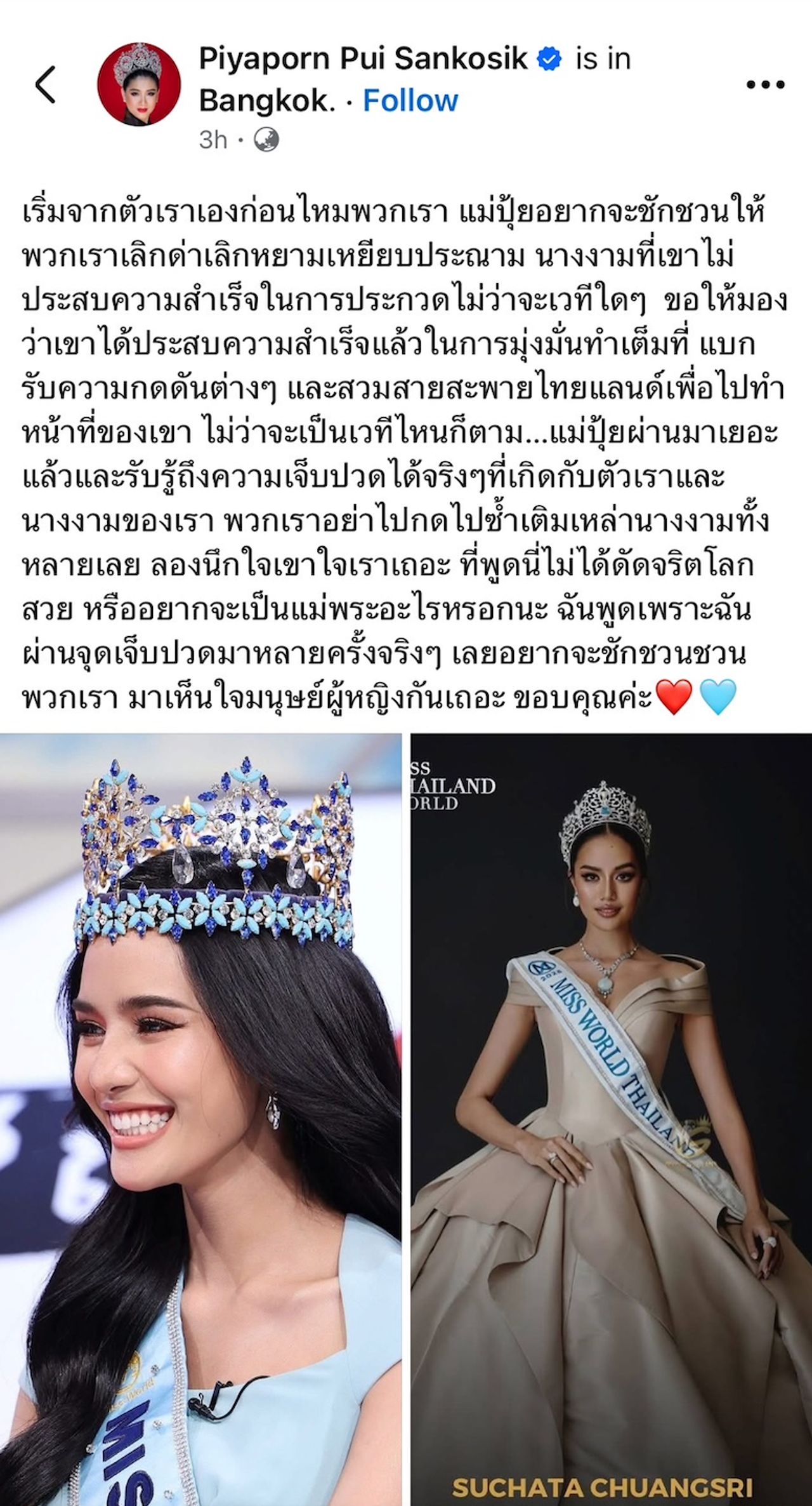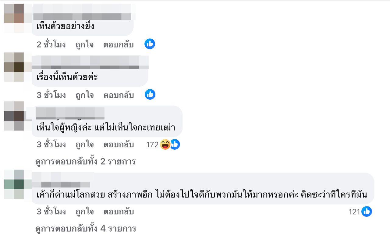 แม่ปุ้ยผ่านมาเยอะแล้ว และรับรู้ถึงความเจ็บปวดได้จริงๆ ที่เกิดกับตัวเราและนางงามของเรา พวกเราอย่าไปกดไปซ้ำเติมเหล่านางงามทั้งหลายเลย