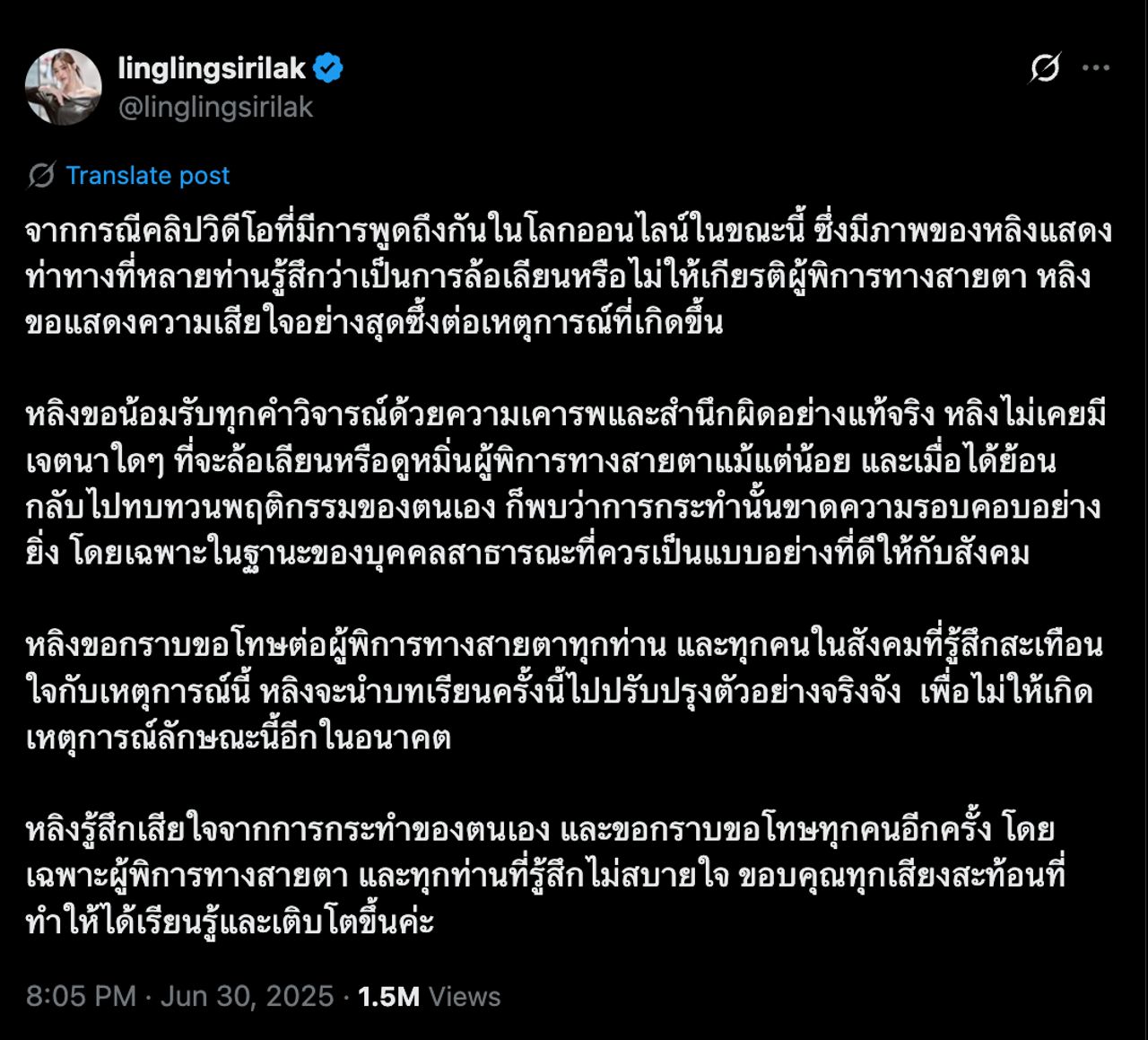 หลิงรู้สึกเสียใจจากการกระทำของตนเอง และขอกราบขอโทษทุกคนอีกครั้ง โดยเฉพาะผู้พิการทางสายตา และทุกท่านที่รู้สึกไม่สบายใจ ขอบคุณทุกเสียงสะท้อนที่ทำให้ได้เรียนรู้และเติบโตขึ้นค่ะ"
