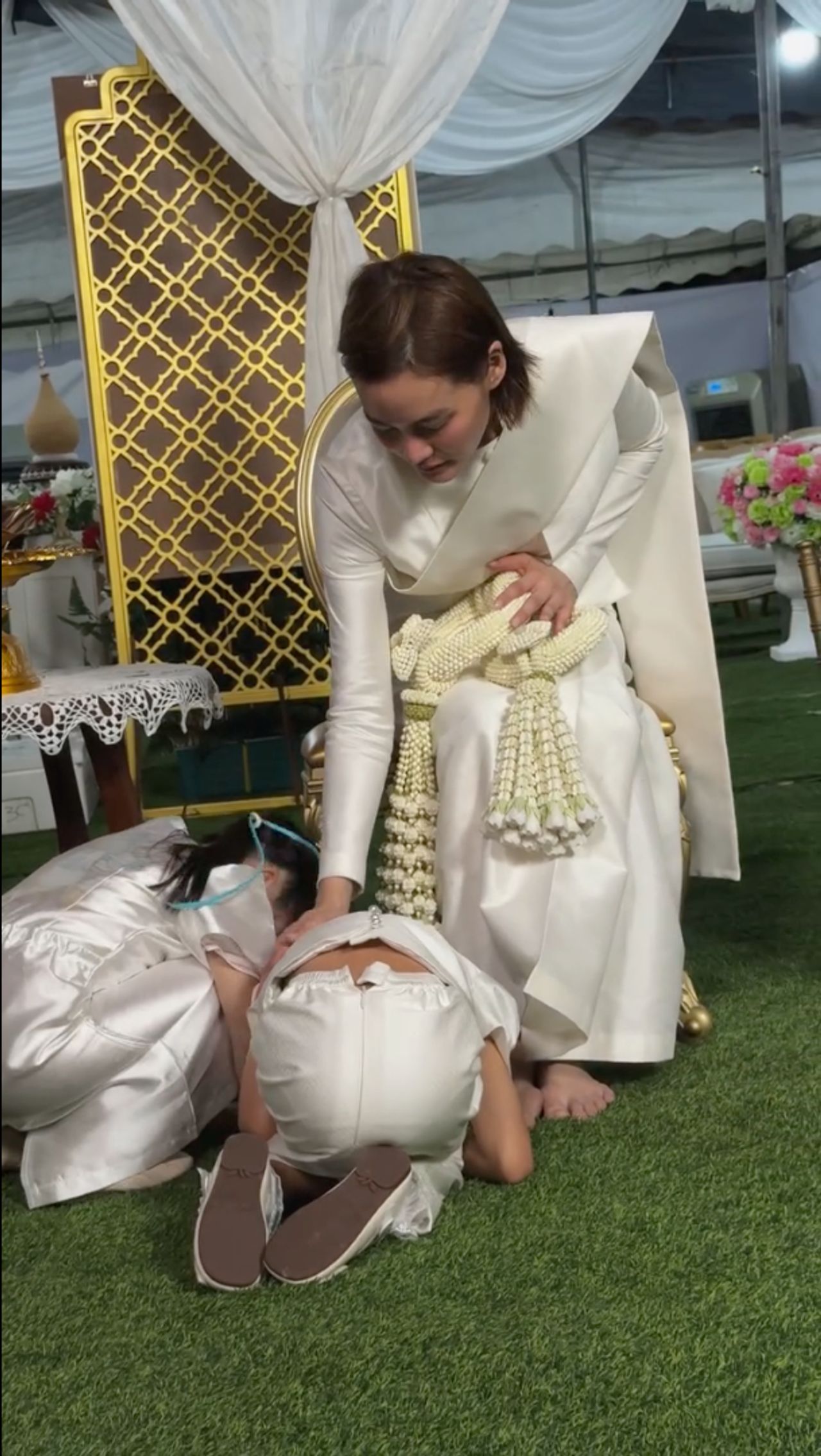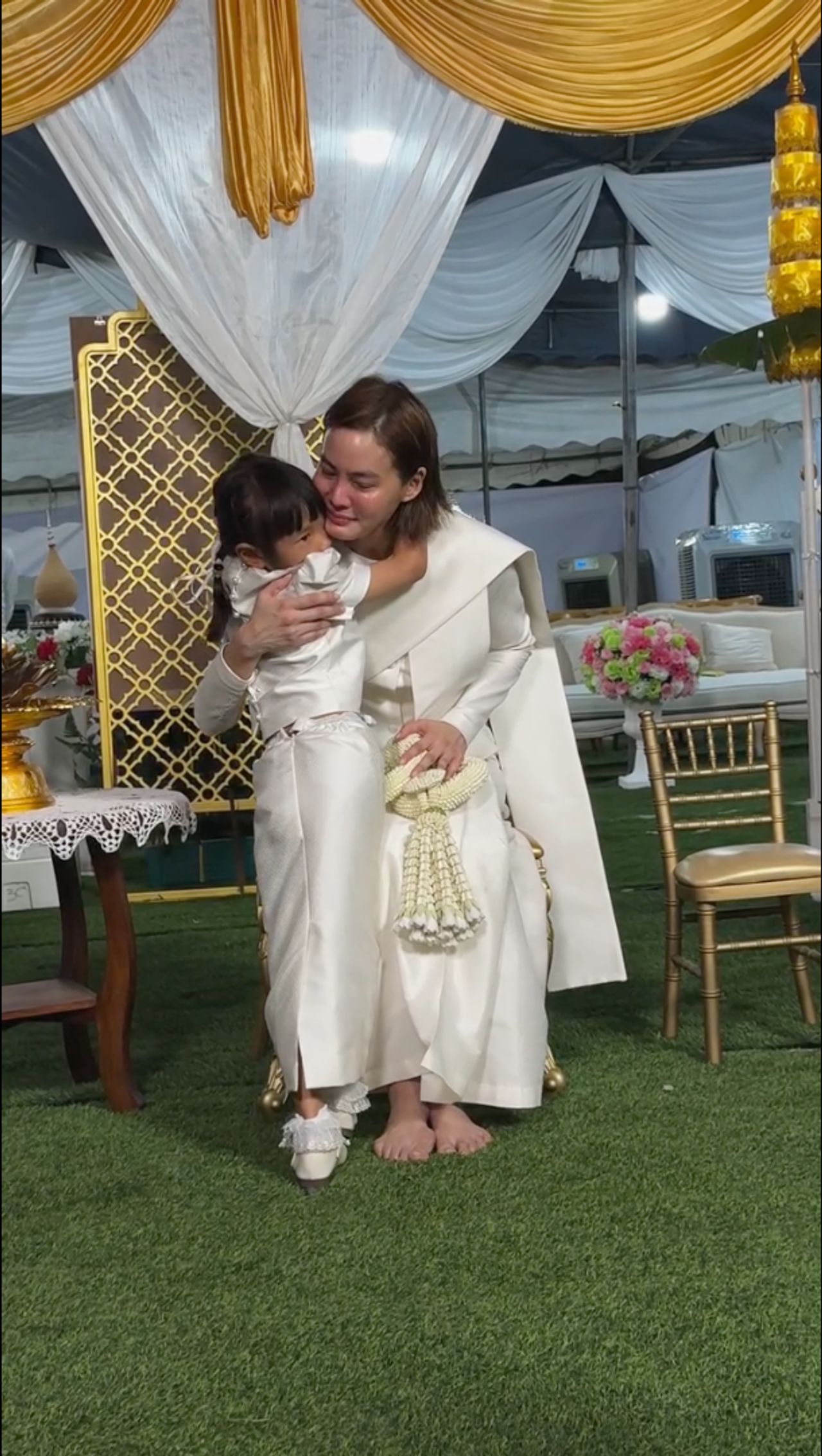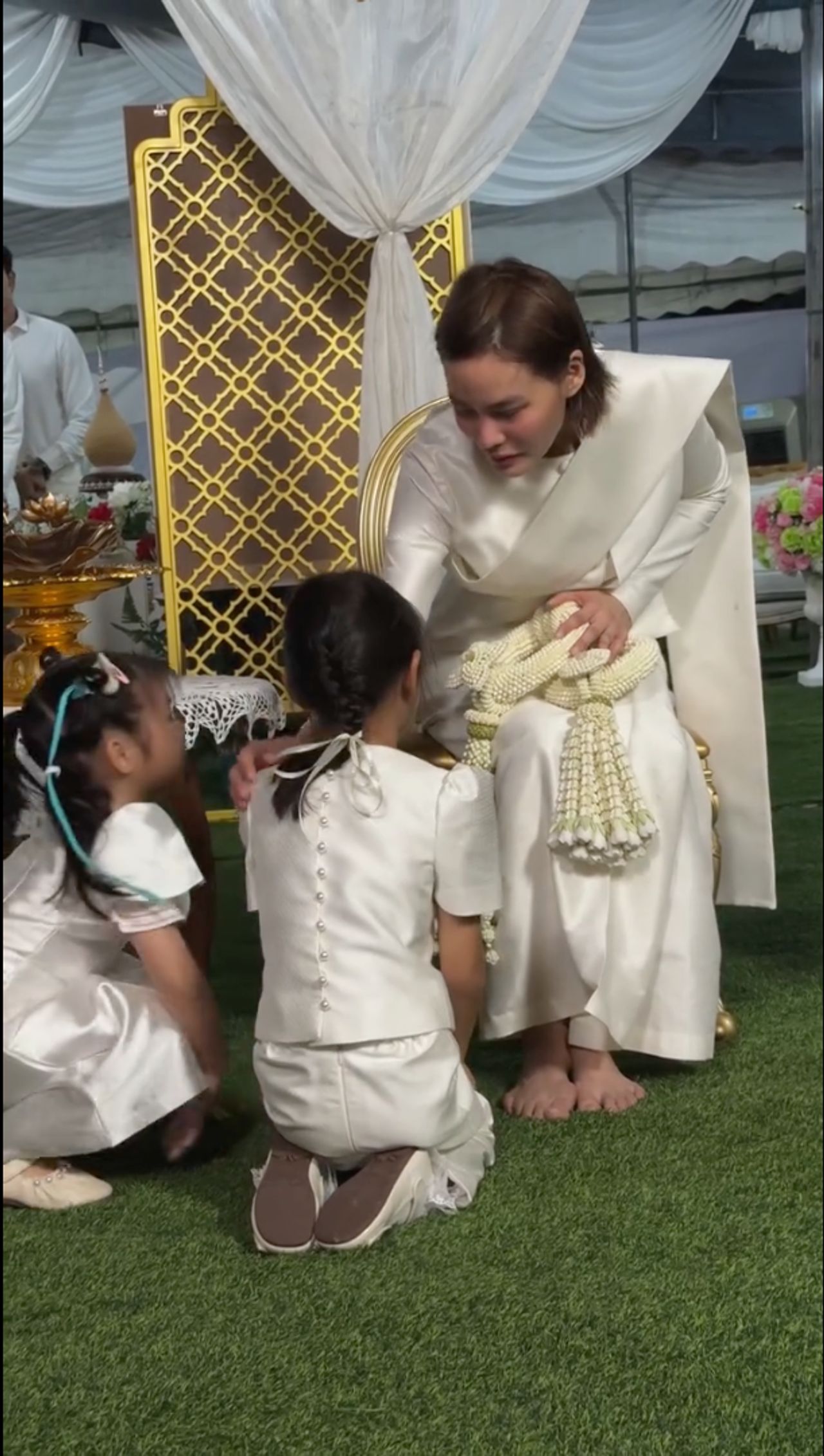 และอีกหนึ่งโมเมนต์ที่น่าประทับใจเช่นกัน เมื่อ น้องโนล่า ลูกสาวของเจนี่ ที่มาร่วมพิธี ก้มกราบคุณแม่ด้วยกิริยาน่ารักเรียบร้อยมากๆ ซึ่งเจนี่ก็ได้ลูบหัวและหลังของลูกสาวด้วยความรัก ก่อนที่น้องโนล่าจะเข้ามากอดคุณแม่ด้วย ซึ่งนานาก็ได้เขียนแคปชั่นบรรยายคลิปนี้ว่า “แม่กับลูกสาว และ ลูกสาวกับแม่ @janienineeleven”