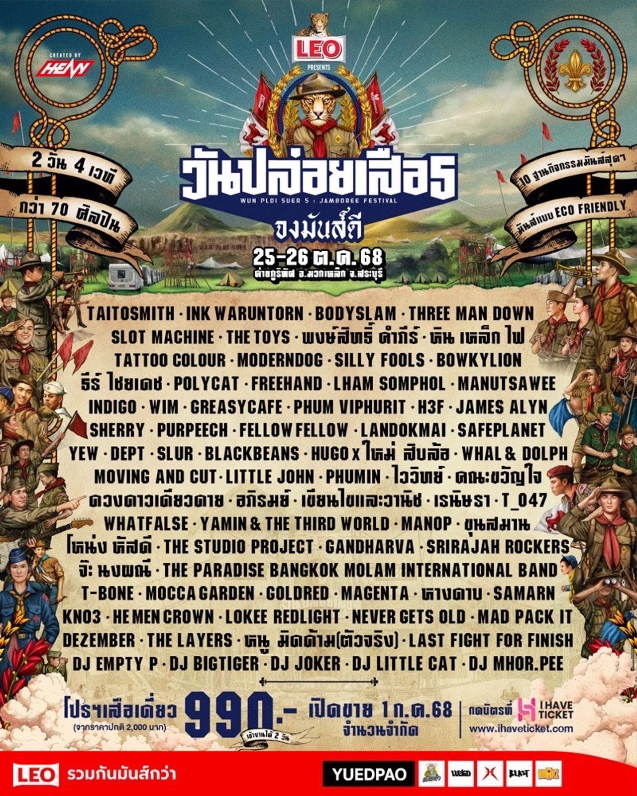 ได้แก่ BODYSLAM, TAITOSMITH, INK WARUNTORN, THREE MAN DOWN, SLOT MACHINE, THE TOYS, พงษ์สิทธิ์ คำภีร์, หิน เหล็ก ไฟ, TATTOO COLOUR, MODERNDOG, SILLY FOOLS, BOWKYLION, ธีร์ ไชยเดช, POLYCAT, FREEHAND, LHAM SOMPOL, มนัสวีย์, INDIGO, WIM, GREASYCAFE, PHUM VIPHURIT, H3F, JAMES ALYN, SHEERY, PURPEECH, FELLOW FELLOW, LANDOKMAI, SAFEPLANET, YEW, DEPT, SLUR, BLACKBEANS, HUGO x ใหม่ สิบล้อ, WHAL & DOLPH, MOVING AND CUT, LITTLE JOHN, PHUMIN, ไววิทย์, คณะขวัญใจ, ดวงดาวเดียวดาย, อภิรมย์, เขียนไขและวาณิช, เรนิษรา, WHATFALSE, T_047, YAMIN & THE THIRD WORLD, MANOP, THE STUDIO PROJECT, GANDHARVA, SRIRAJAH ROCKERS, จ๊ะ นงผณี, THE PARADISE BANGKOK MOLAM INTERNATIONAL BAND, T-BONE, MOCCA GARDEN, GOLDRED, MARGENTA, หางดาบ, สามานย์, KNO3, HEMENCROWN, LOKEE REDLIGHT, NEVER GETS OLD, MAD PACK IT, DEZEMBER, THE LAYERS, หนู มิดด้าม (ตัวจริง), โหน่ง หัสดี, LAST FIGHT FOR FINISH, ขุนสมาน และ DJ EMPTY P ที่พร้อมเสิร์ฟความมันส์ผ่านดนตรีแบบไม่จำกัดแนว จัดเต็ม 2 วัน 4 เวที ใน วันที่ 25 และ 26 ตุลาคม 2568 นี้ ณ ค่ายลูกเสือภูริทัต อ.มวกเหล็ก จ.สระบุรี