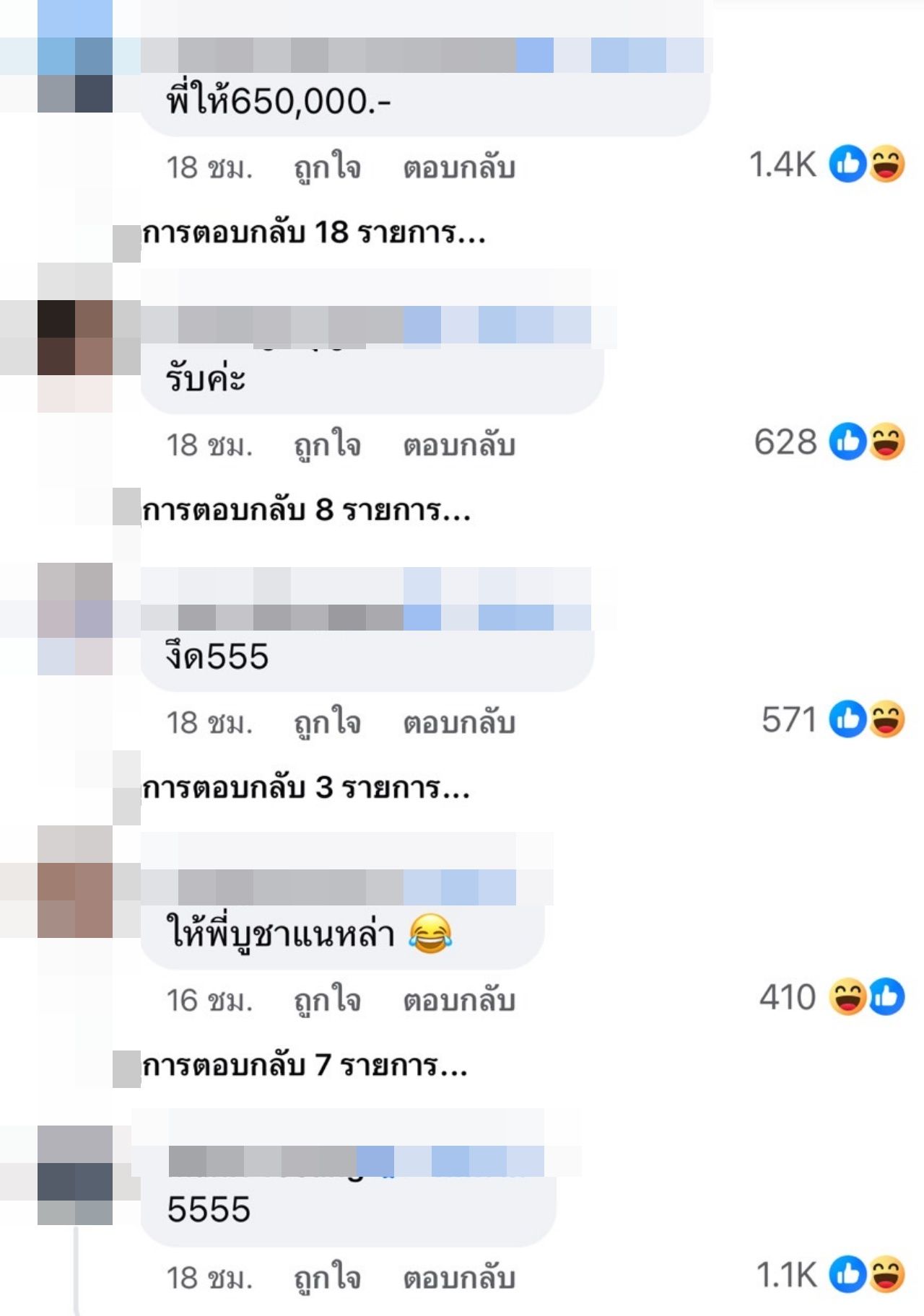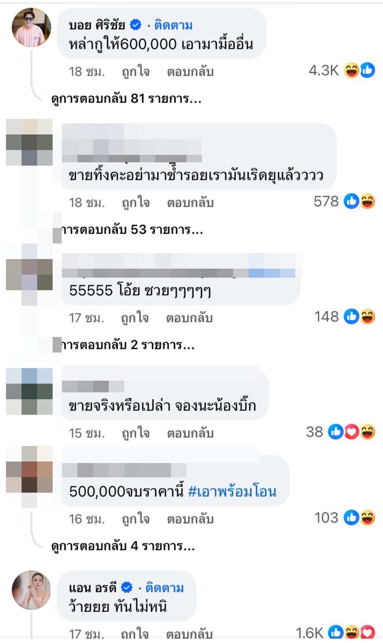 งานนี้ทำเอาหลายคนที่ติดตามทั้งเพื่อนๆ ในวงการนักร้องและแฟนคลับเข้ามาคอมเมนต์กันจำนวนมาก พร้อมกับพากันต่อคิวขอต่อซื้อกันเป็นแถว แถมมีเพิ่มราคาให้อีกด้วย อาทิ ขายจริงไหม พร้อมโอนจ่ายสด, หล่ากูให้ 600,000 เอามามื้ออื่น, 500,000 จบราคานี้ #เอาพร้อมโอน, ขายจริงหรือเปล่า จองนะน้องบิ๊ก, ว้ายยย ทันไม่หนิ, พี่ให้ 650,000.-, ผมให้ล้าน5 ครับ, 700,000 มาาาา, เอื้อยเอาๆ, รับค่ะ เป็นต้น
