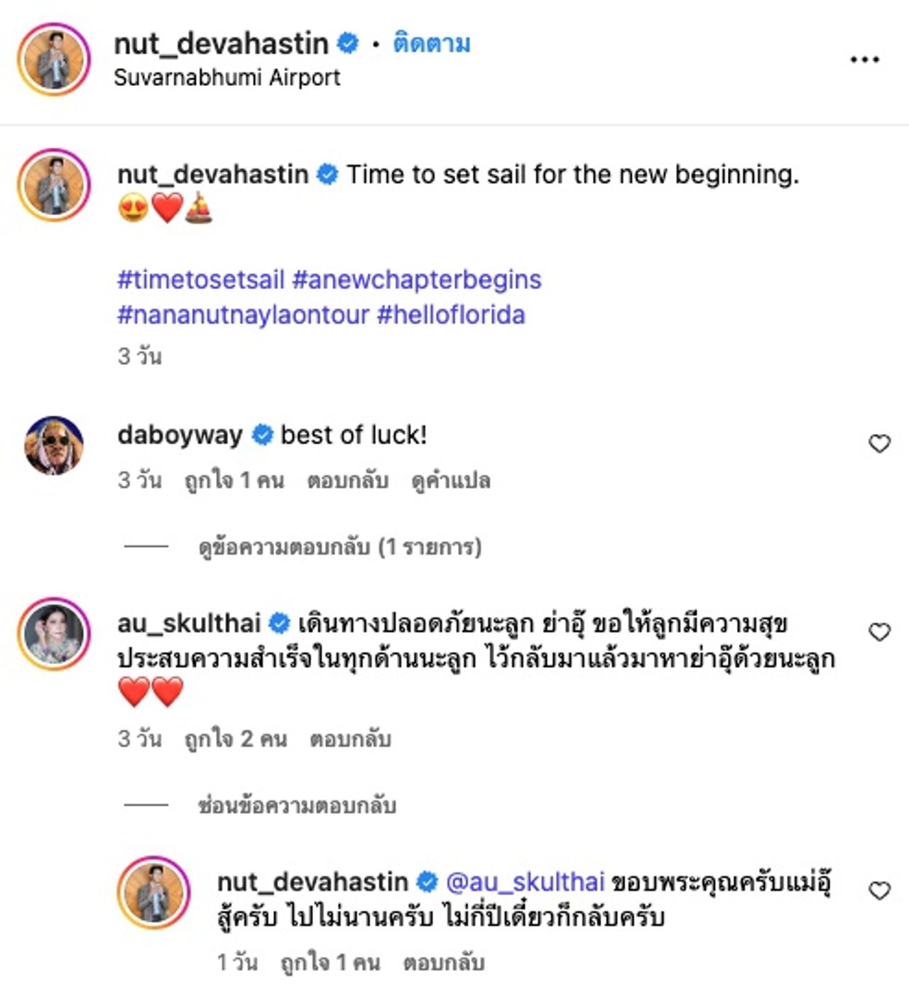อีกทั้งณัฏฐ์ยังโพสต์ภาพครอบครัวและเช็กอินที่สนามบินสุวรรณภูมิ พร้อมทั้งเขียนข้อความทักทายสวัสดีฟลอริด้า โดยบอกว่า “Time to set sail for the new beginning. #timetosetsail #anewchapterbegins #nananutnaylaontour #helloflorida”