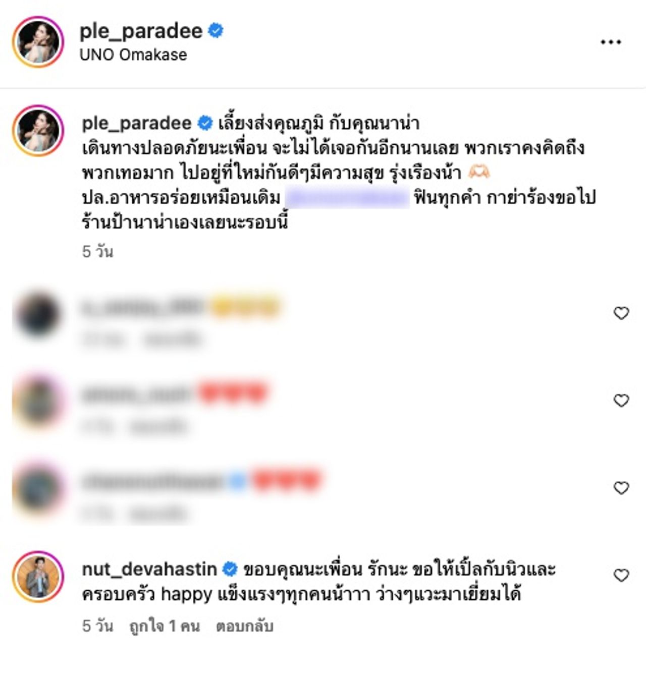 ในขณะที่อินสตาแกรม @ple_paradee ของเปิ้ล ภารดี ก็ได้โพสต์ภาพบรรยากาศเช่นกัน พร้อมทั้งเขียนข้อความว่า “เลี้ยงส่งคุณภูมิ กับคุณนาน่า เดินทางปลอดภัยนะเพื่อน จะไม่ได้เจอกันอีกนานเลย พวกเราคงคิดถึงพวกเทอมาก ไปอยู่ที่ใหม่กันดีๆ มีความสุข รุ่งเรืองน้า” และ ณัฏฐ์ ตอบกลับว่า “ขอบคุณนะเพื่อน รักนะ ขอให้เปิ้ลกับนิวและครอบครัว happy แข็งแรงๆทุกคนน้าาา ว่างๆ แวะมาเยี่ยมได้”