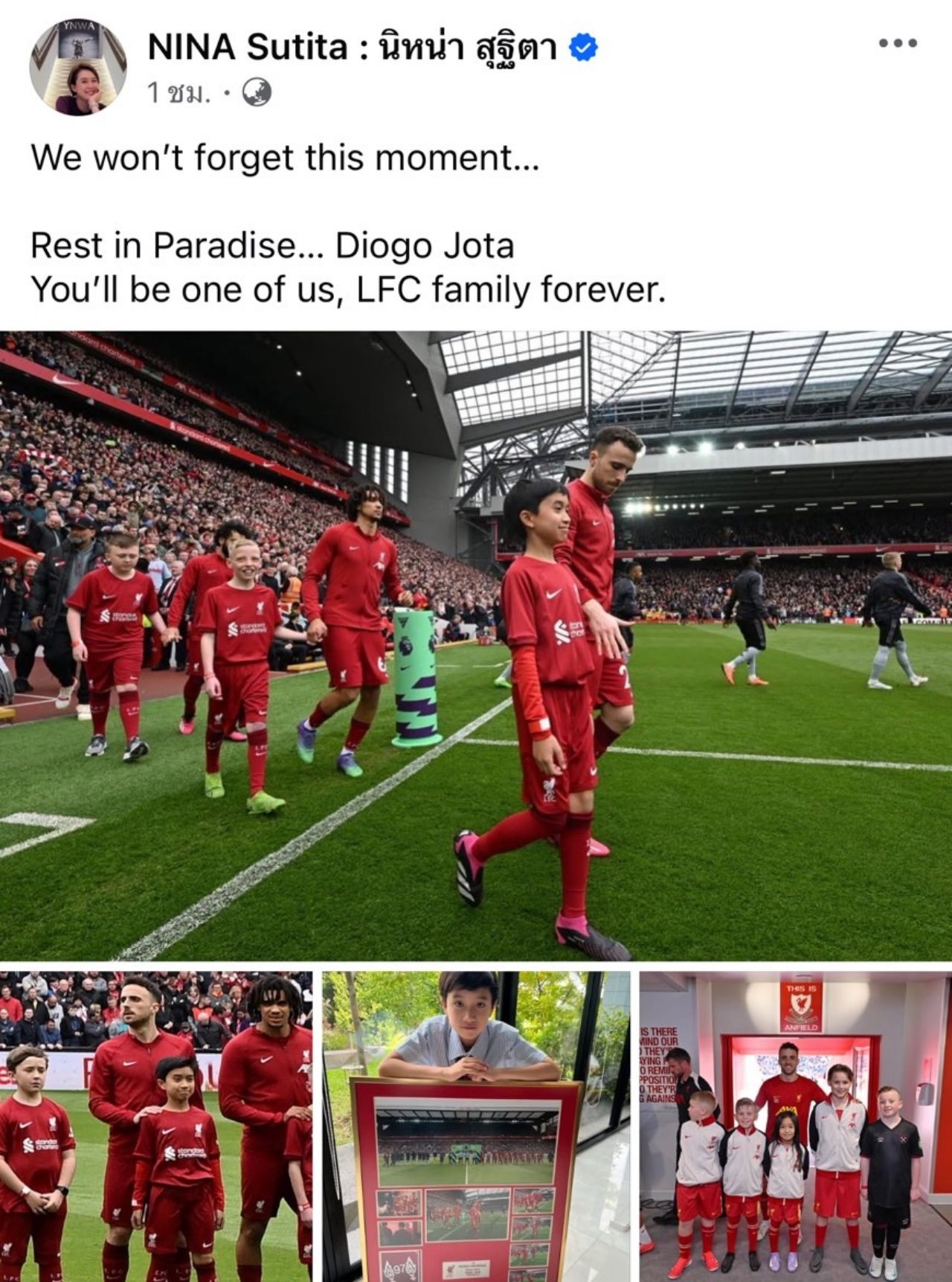 ทางด้าน นิหน่า สุฐิตา ซึ่งเป็นแฟนบอลลิเวอร์พูลตัวยง ได้โพสต์ภาพของ น้องแพทริก ลูกชาย ที่ครั้งหนึ่งเคยทำหน้าที่เป็นเด็กจูงมือนักบอล (Lucky Boy) ที่ได้จูงมือ ดิโอโก้ โชต้า ลงสนามฟุตบอล พร้อมเขียนข้อความอาลัย